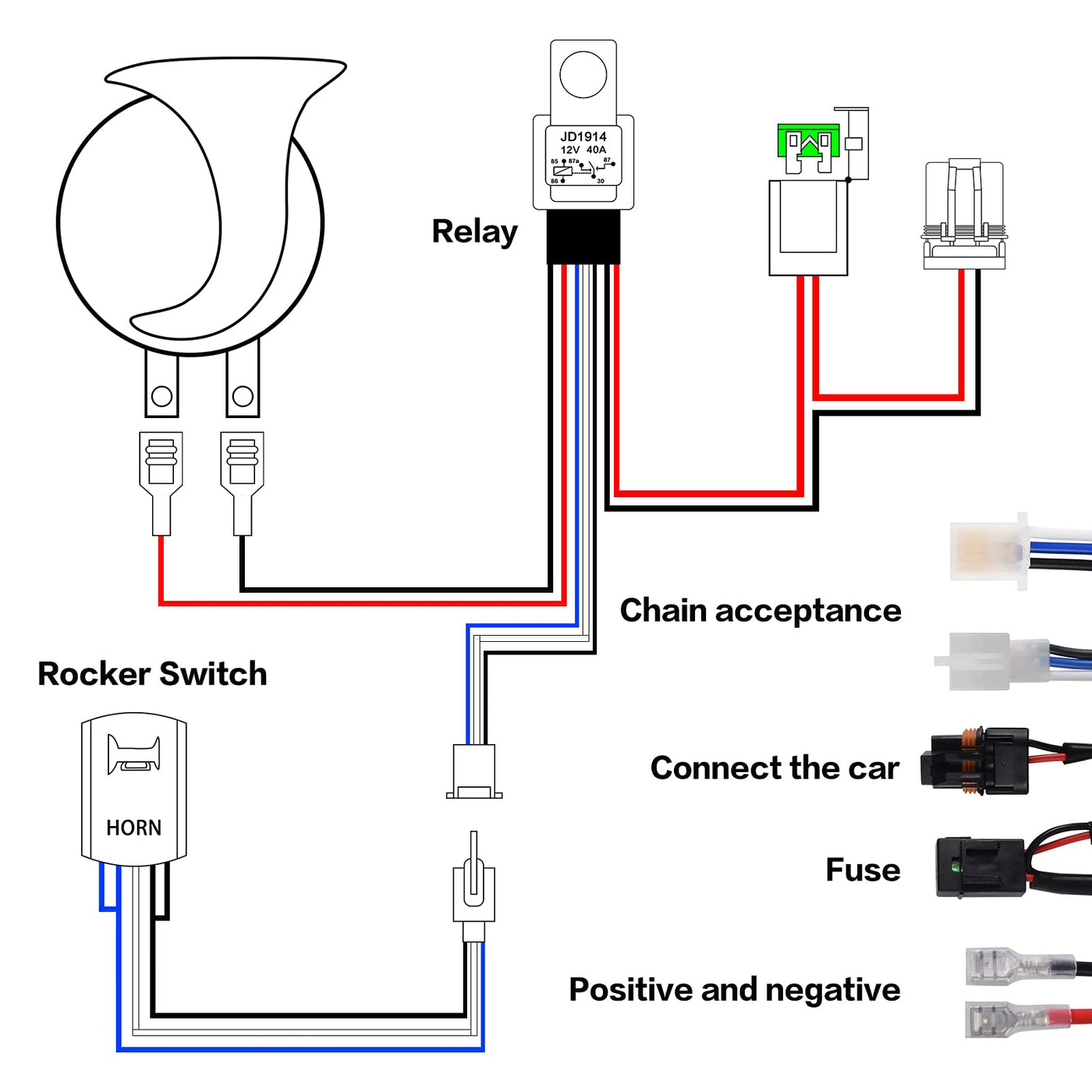 Q: How does the rocker switch work with the horn kit?A: The upgrade momentary LED rocker switch allows you to easily activate the horn. It features a flexible design that automatically returns to its original position after pressing, making it easy to use even in low-light conditions.
