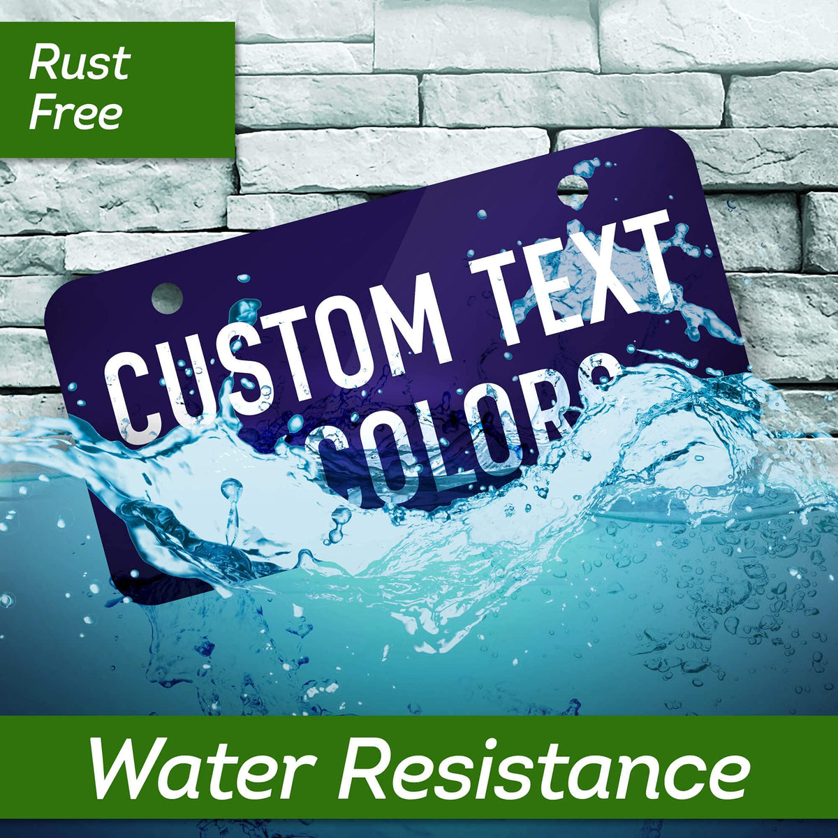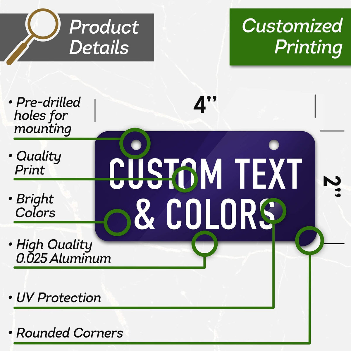 'My Sign Center, manufacturers and distributes a wide variety of signage for personal and business use. With a passion for creativity and design, We believe in the life-changing power of creative designs and their ability to enhance communications, that's why our goal is to be Your Store For All Signage Needs and bring the world together in understanding on sign at a time. Our custom aluminum name tag license plates which can be customized with one line of your own custom wording plus a header and footer message are made out of industrial grade .032 aluminum that are painted and coated with special coating to prevent the licence plate accessories from corroding and rusting. They are all carefully and professionally designed with beautiful colors options and choices of different font styles so your personalized front license plates looks exactly the way you want like it. These license plate decor are printed with outdoor grade inks that will withstand the elements of the weather, and are designed to adhere aggressively to the surface and prevent the graphics from peeling or easily being scratched. An extra layer of UV coating is also added for protection and to give it a nice glossy finishing touch. They come with two pre-slotted holes on the top and bottom so that you can mount them easily and quickly without any delay. Radius corners are also added to each customized license plate for safety and design. These custom license plates measure 2'' x 4'' and are 0.32'' thick, The Perfect size for your kids Car, bicycle, toys accessories or perhaps your favorite novelty gift license plates. Communicate your important message in a bright, safe, and easy to read way. ''