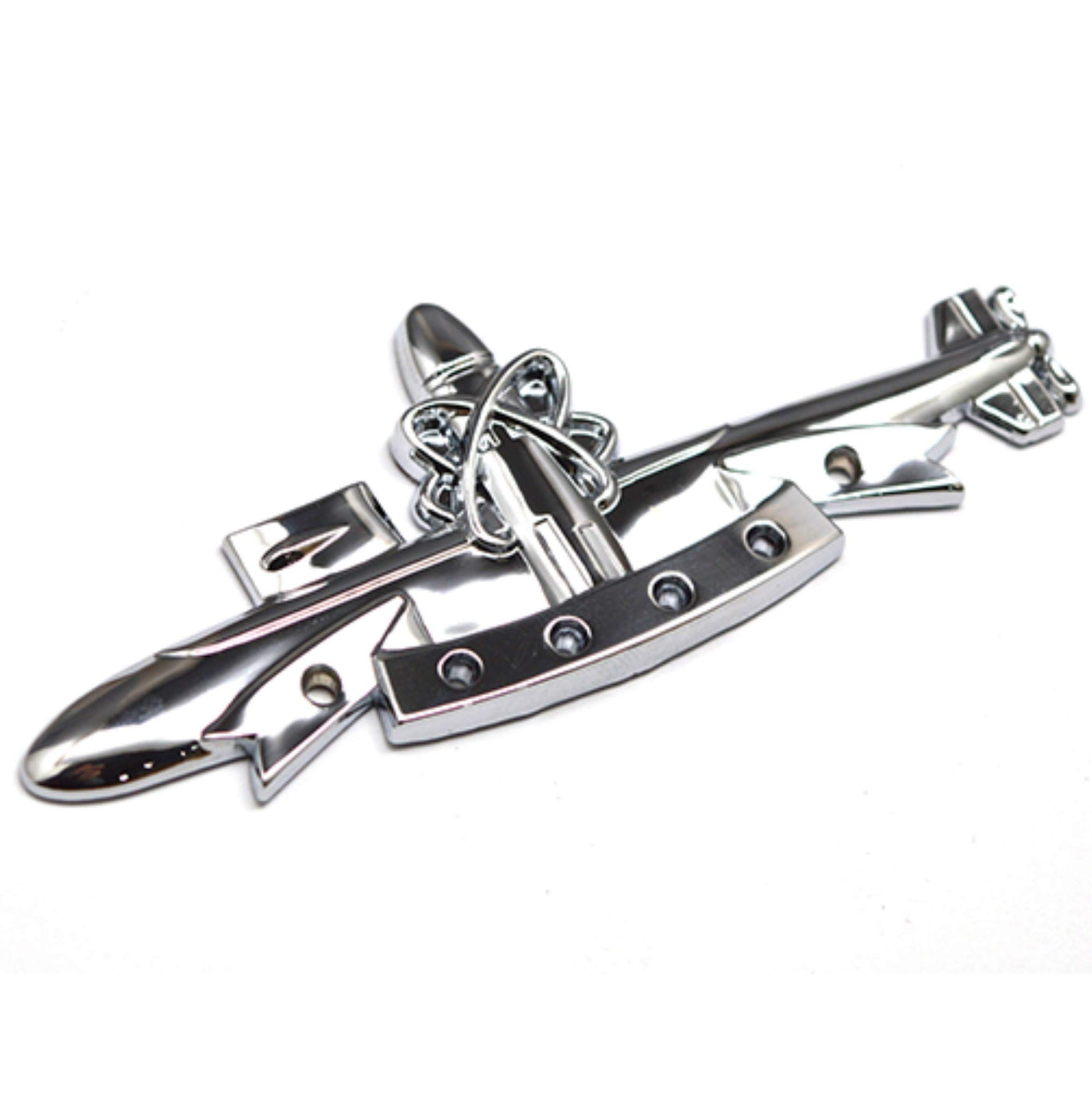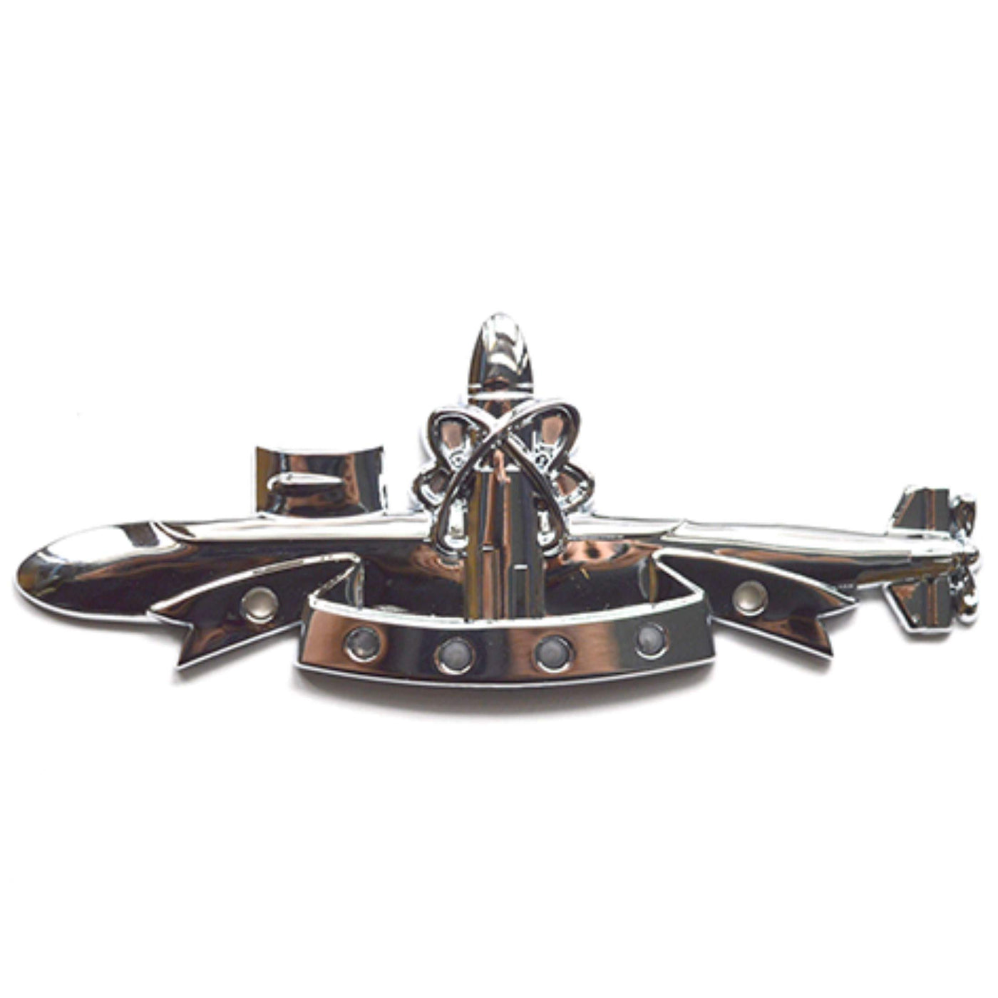 Q: What material is the Navy SSBN Submarine Deterrent Patrol auto emblem made of?A: The Navy SSBN Submarine Deterrent Patrol auto emblem is made of solid metal and plated with weather-resistant chrome, ensuring durability and a premium finish.