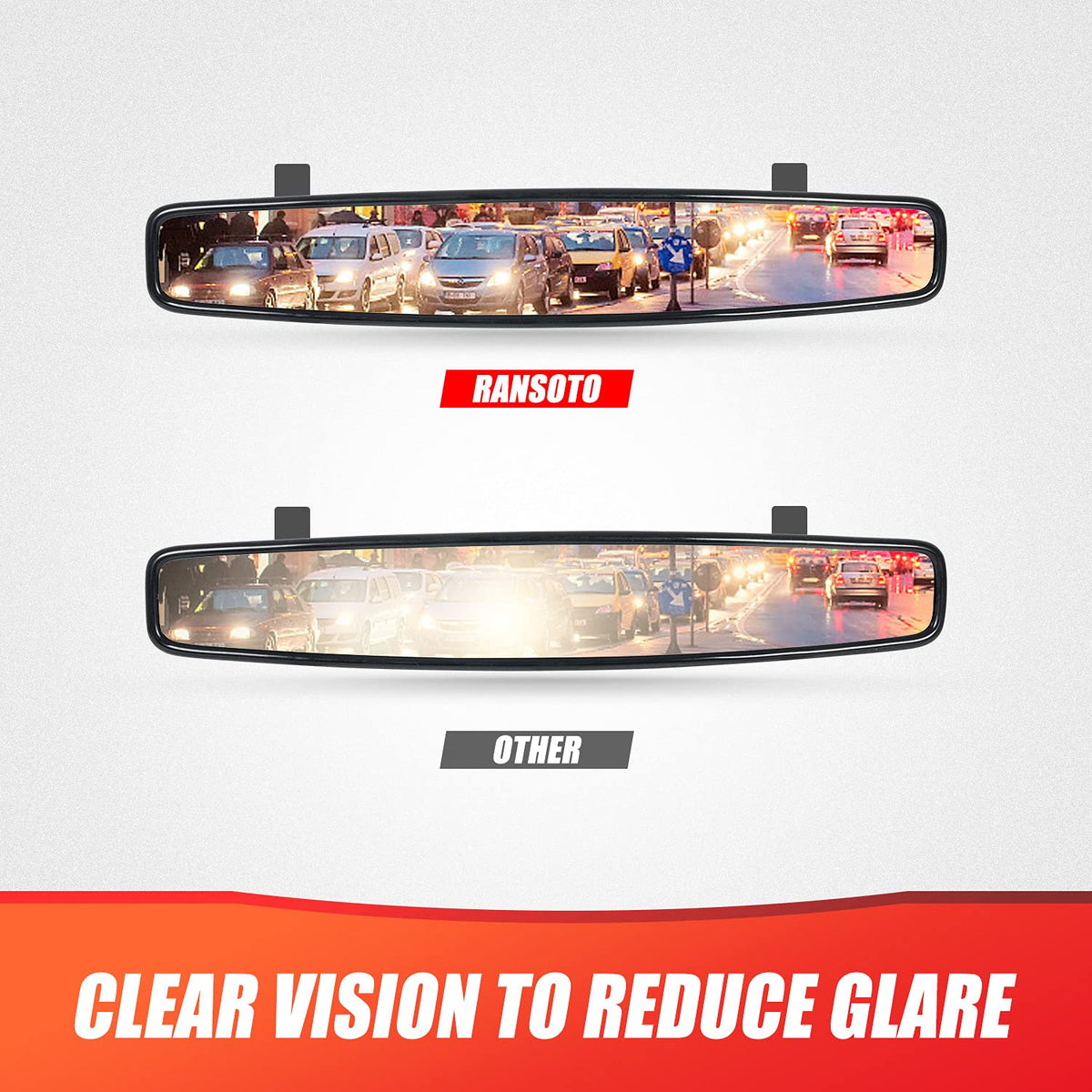 Q: What are the dimensions of the RANSOTO rear view mirror?A: The RANSOTO rear view mirror measures 15 inches in length, providing a clear and broad vision to enhance your safety while driving.