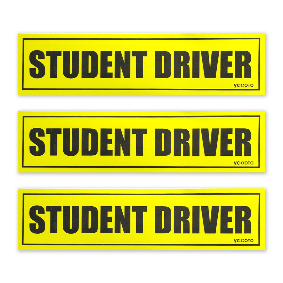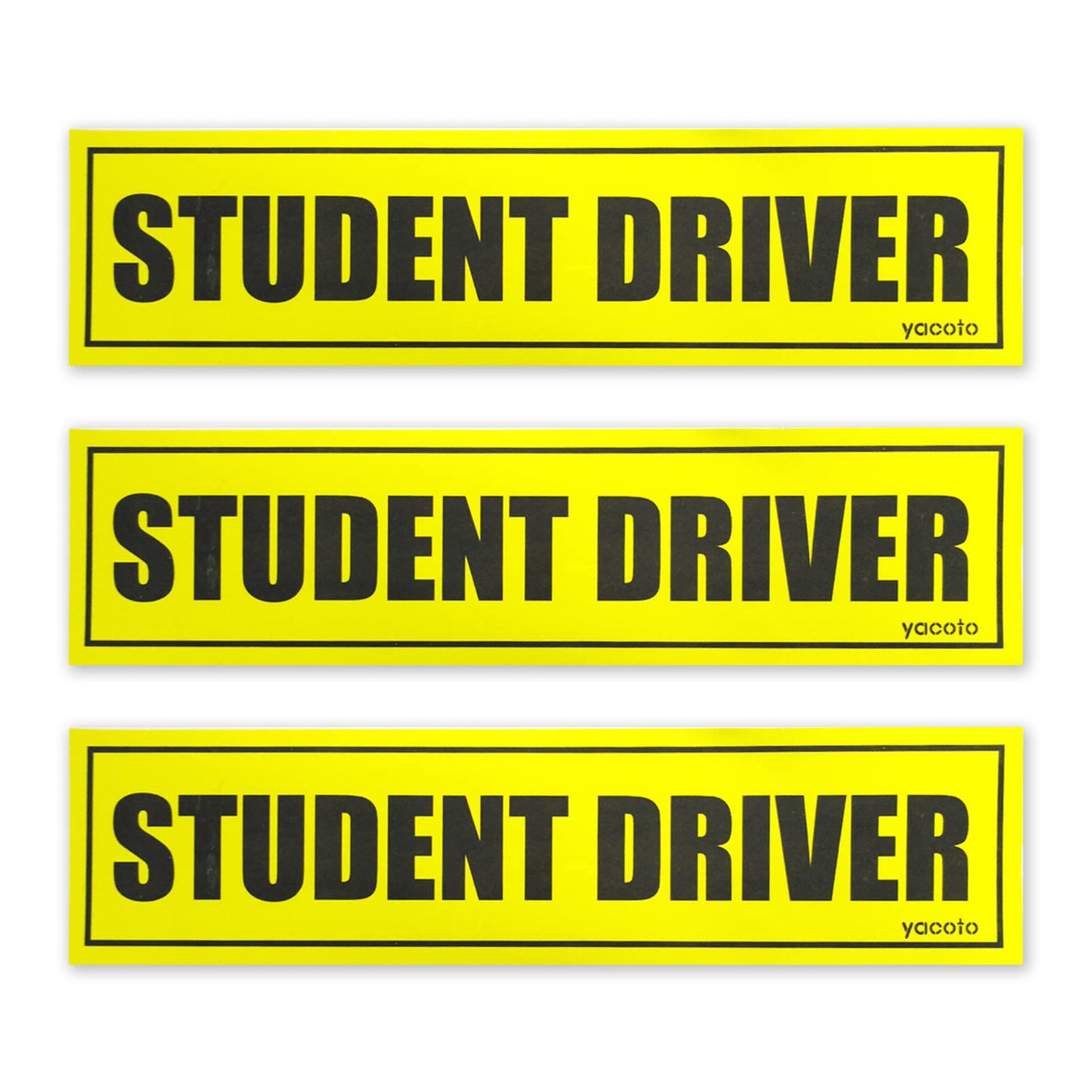 About the product - The reflective student driver decal is crafted with black lettering that perfectly combined with a vibrant yellow background color which is so readable even a distance. - By being noticeable to the nearby drivers will prevent accident for they will give you patience, respect and enough space to practice. - This high quality student driver car magnet is tested to last well pass the new driver stage. It can easily be switched from vehicle to vehicle or to another metal surface as it is removable and reusable. - Comes with 3 pack student driver stickers, perfect for each side and the rear. Reflective for added safety in low light or night time driving conditions. - Student driver sign is a great way to protect your new driver by alerting other drivers to use caution when in close proximity to your vehicle. - No need to worry about driving not skilled, just go on your way.