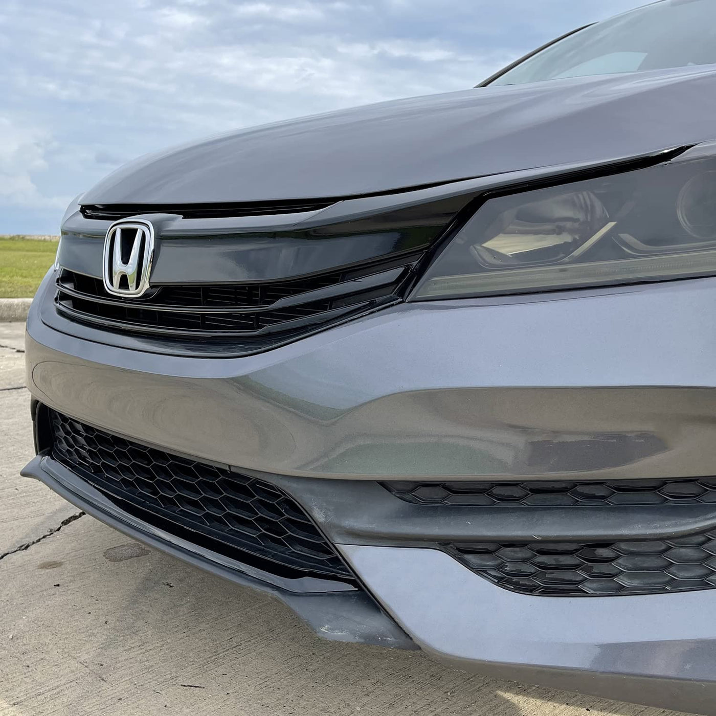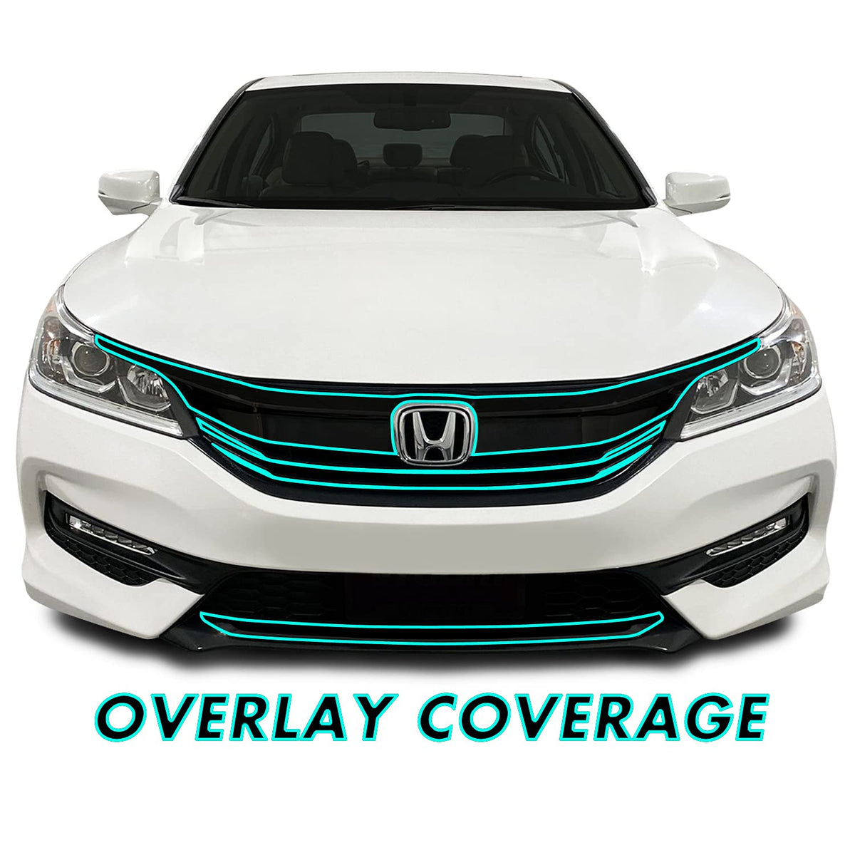 Q: What is the SlickMod Chrome Delete Blackout Vinyl Overlay used for?A: The SlickMod Chrome Delete Blackout Vinyl Overlay is designed to cover the chrome trims on the front grill of the 2016-2017 Honda Accord Sedan, providing an aggressive blackout look that enhances the vehicle's aesthetics.