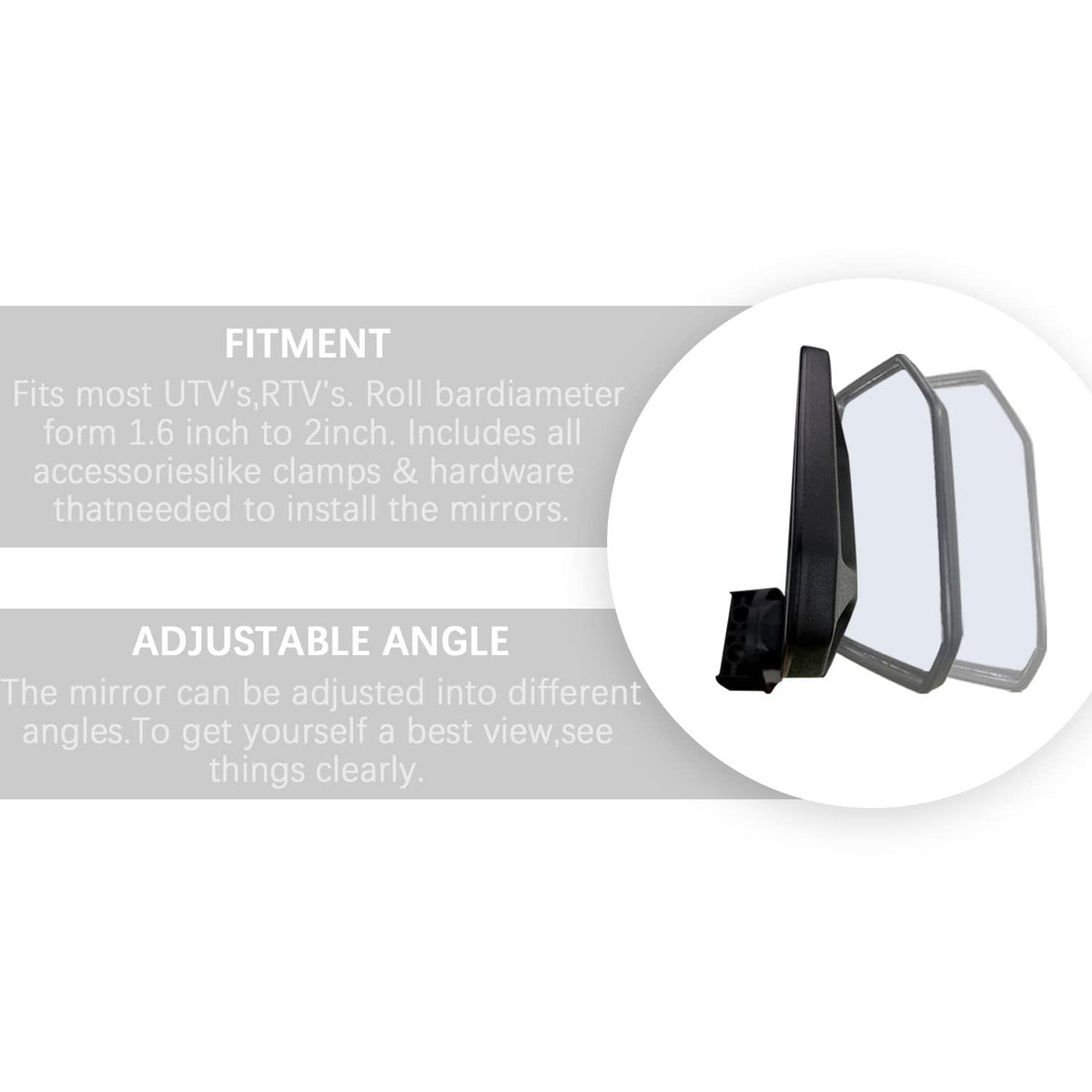 FITMENT: Replacement for 2014-2020 Polaris RZR XP 1000 2 & 4 seat models Replacement for 2016-2020 Polaris RZR 900 , 900 S, 4 900 S, and 900 Trail 50'' models Replacement for all Polaris Ranger 400, 500, 700, 800 Replacement for 2010-2015 John Deere GATOR HPX & XUV Replacement for Kawasaki MULE 600, 610, 2500, 2510, 3000, 3010, 4000, 4010 Replacement for Kawasaki TERYX 750 Replacement for 2017-2021 CAN AM X3, X3 900, XDS, XRS Replacement for CAN AM COMMANDER 2 & 4 SEAT MODELS Replacement for Honda Pioneer 700 & 1000 MODELS DO NOT FIT: Polaris Ranger XP 900, 1000 & 2015+ 570 MODELS Polaris General PACKAGE: 1* Pair UTV Side Mirrors( Driver Side and Passenger Side) 4* Rubber Pads 4* Mounting Clamps 4* Mounting Screwsutv accessoriesside by side atv,utv mirrors,side by side accessories utv,rzr accessories