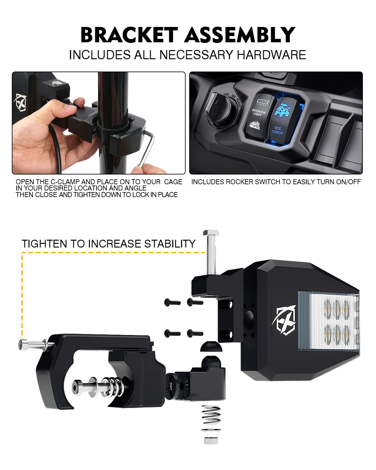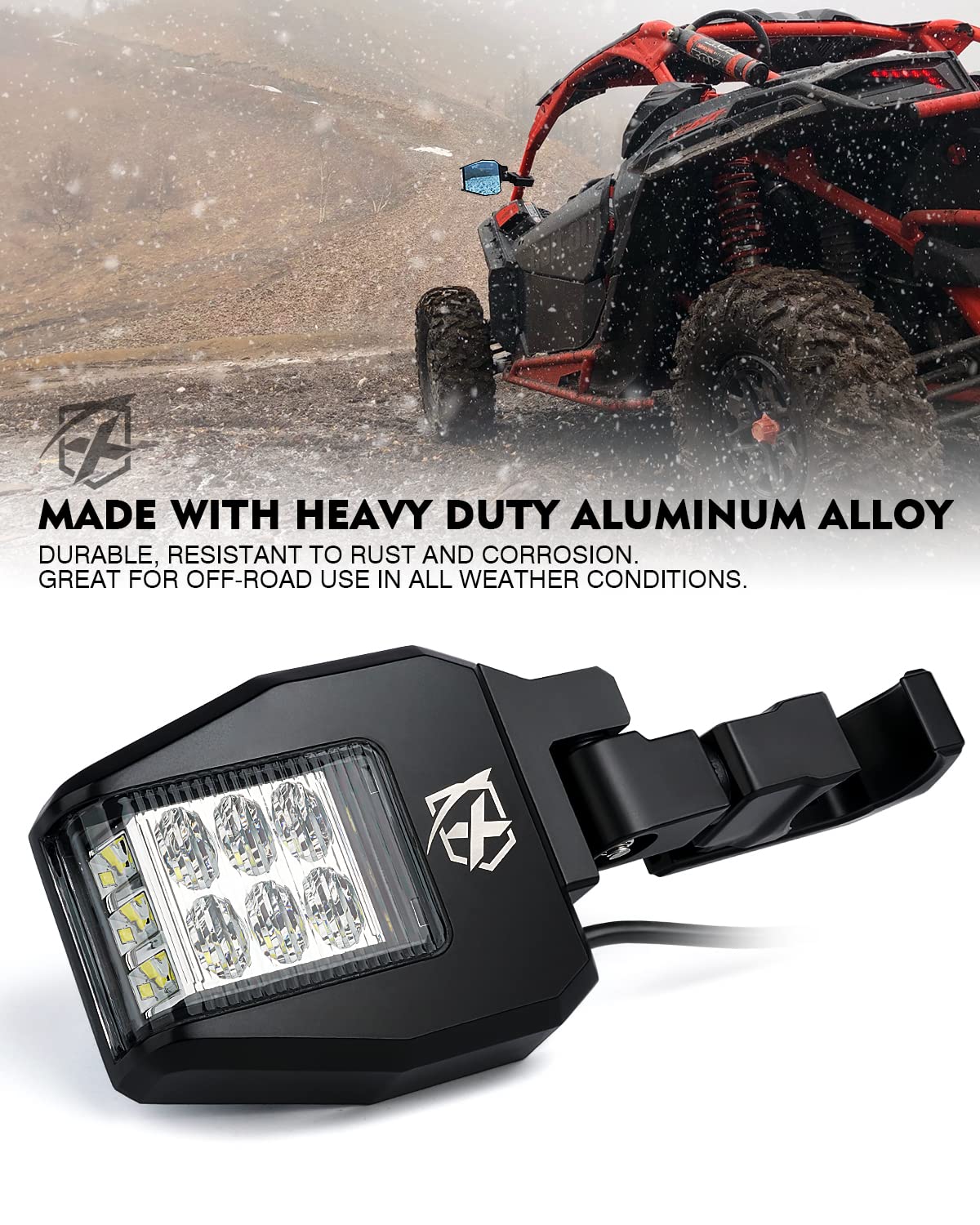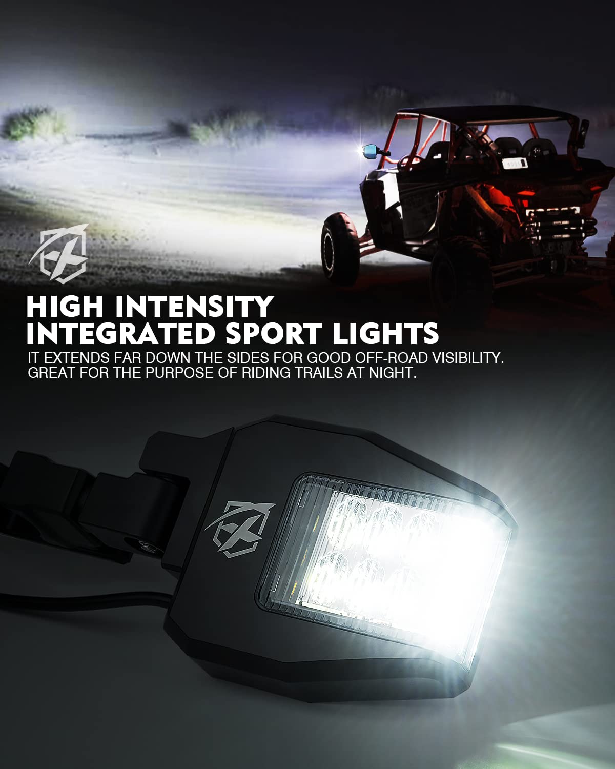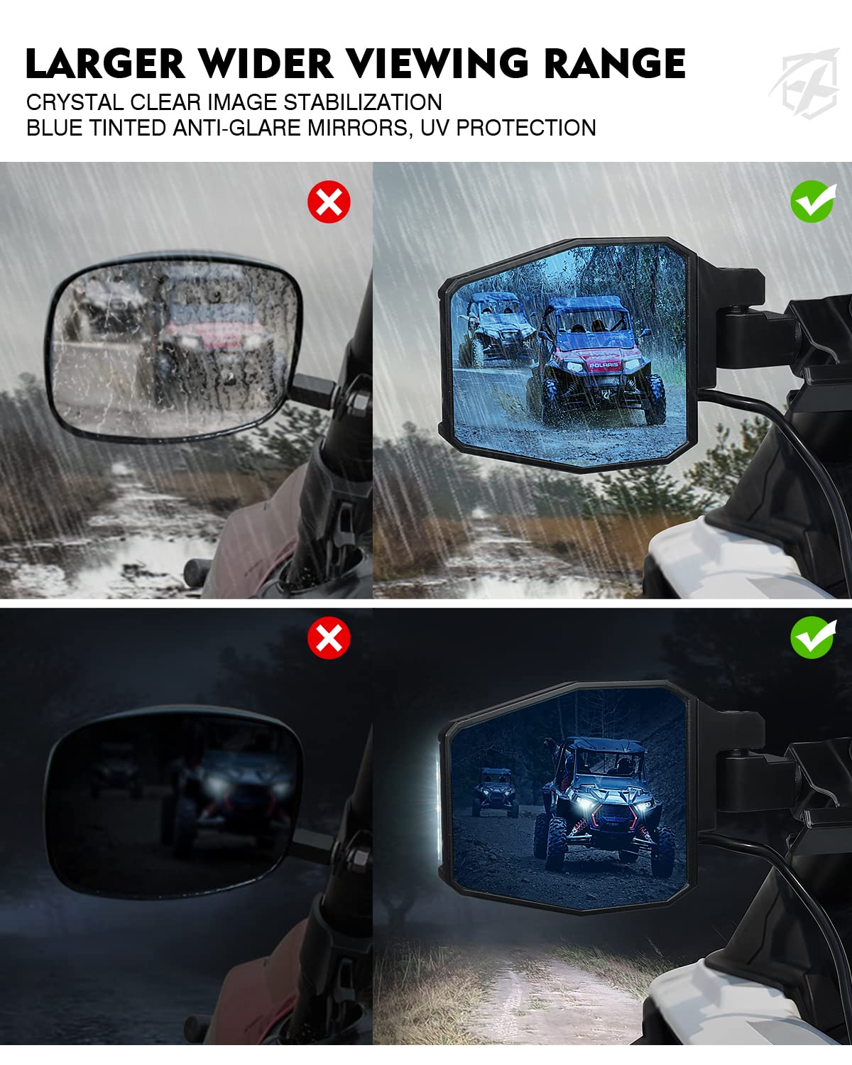 XPRITE CLASSIC SIDE MIRROR - This UTV side rearview mirror with integrated LED lighting to increase visibility. Heavy- duat aluminum alloy housing is designed to withstand the most extreme punishment. Blue tinted anti-glare UTV sideview mirrors updated with a new design that provides a clear High-definition view day and night without distortion. | SUPER BRIGHT INTEGRATED LED LIGHT - Each side has 9 high-powered LEDs that provide high-intensity illumination to boost visibility and the trail ahead, but can't blind the opposite driving vehicles. Includes wiring harness and rocker switch for easy installation. | HIGH QUALITY - Heavy-duty aluminum alloy housing and adjustable C-clamp mounting brackets, more sturdy and durable, corrosion resistant. Adds both style and safety to your offroading adventures. Larger wider viewing range mirrors to improve safety and awareness. | EASY INSTALLATION - Rubber vibration isolators for keeping a clear image and the mirrors from sliding. Position tension adjustment bolts for keeping mirror in place at just the right angle, adjustable aluminum brackets fits 1.75' to 2' Rollbars. Compatible with most windshields. Compatible with Polaris RZR 800 S 900 XP 1000 Turbo, Kawasaki Mule 600 610 2500 /Teryx 750, Honda Pioneer 700/1000, Yamaha Rhino/YXZ/Viking/Wolverine, Kubota RTV 900/1100, Arctic Cat, Can-Am Maverick, and more. | PRODUCT INCLUDES - 1 x pair of side mirrors (left & right), 1 x wiring harness and rocker switch, and all necessary hardware. Assembly required, please kindly follow the installation to install. If you are not satisfied with this led side mirror light, please feel free to contact us by email.