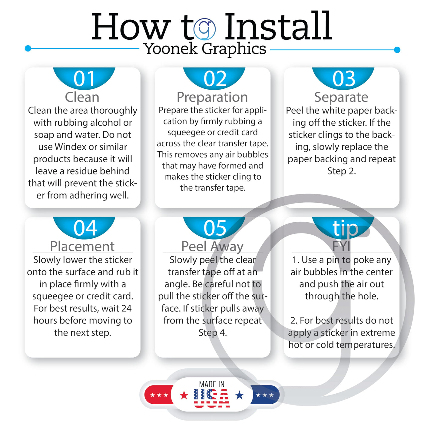 Here at Yoonek Graphics we only use the finest materials to produce our products. Our products are made of high quality Oracal 651Glossy Vinyl. It's waterproof, UV resistant, and easily applied to any smooth surface. Our products are weather tested for 7 years of quality for outdoor use. Don't be fooled by cheap competitors, you pay for what you get, and at Yoonek, you're getting the very best in the business. Applied to: Graphics can be applied to: Vehicle Windows, Vehicle Body Surfaces, Laptop Cases, Motorcycles, Mopeds, Bicycles, Helmets, Tractors, Trailers, Toolboxes, ATV's, Jet Skis, Surfboards, Snowmobiles, Snowboards, Skateboards, Drums, Guitars, Mirrors, Desktop Computer Towers, Boats, Hard Hats, Walls, Smooth Painted Surfaces, Store Windows, Plastic Boxes, Printers, Lockers, Doors, Laminate Surfaces or just about any surface that is smooth and clean. Measurements are in INCHES.