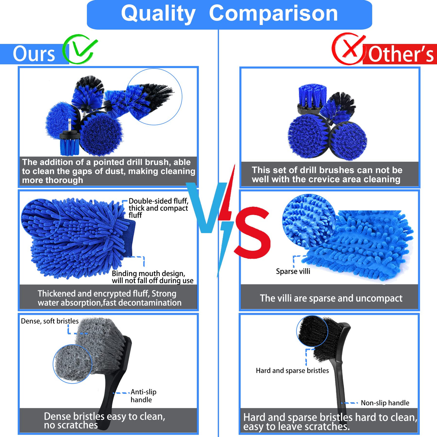 Introducing our comprehensive car detailing kit, complete with all the essential car detailing supplies and tools you need to keep your vehicle looking its best. Our car detail kit includes 5 different detailing brushes, including a microfiber wax applicator, air outlet brush, car dusting brush, and 5 car detailing drill brushes for more intensive cleaning. For washing your car, our kit includes a wash car sponge, 2 car washing towels, and a car cleaning mitt to ensure a thorough clean every time. To polish your vehicle, we have included 3 car polishing pads and 2 woolen polishing pads. To clean the interior of your car, our interior car cleaning kit includes a magic adhesive suction cup, which can be used to remove dirt and debris from hard-to-reach places. Our car detailing kit interior cleaner also includes a cleaning brush, which is ideal for cleaning carpets, upholstery, and other surfaces. For cleaning your car's wheels, we have included a tire brush, rim cleaner brush, and 3 wire brushes. Our wheel brushes for cleaning wheels are designed to reach every nook and cranny, leaving your wheels looking clean and shiny. The wheel cleaner brush is perfect for removing tough dirt and grime from your wheels. In summary, our car detailing kit is the ultimate solution for anyone looking to keep their vehicle looking its best. With a variety of car detailing tools and supplies included, you'll have everything you need to keep your car looking brand new.
