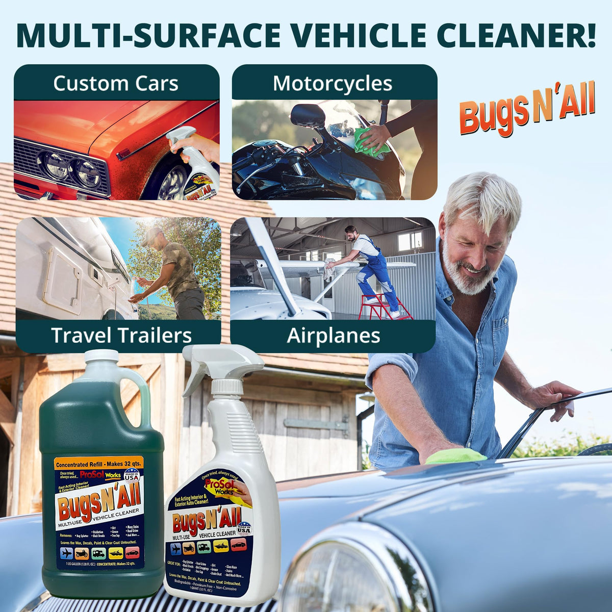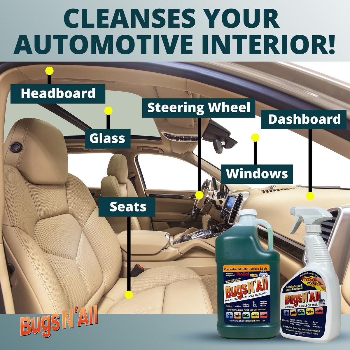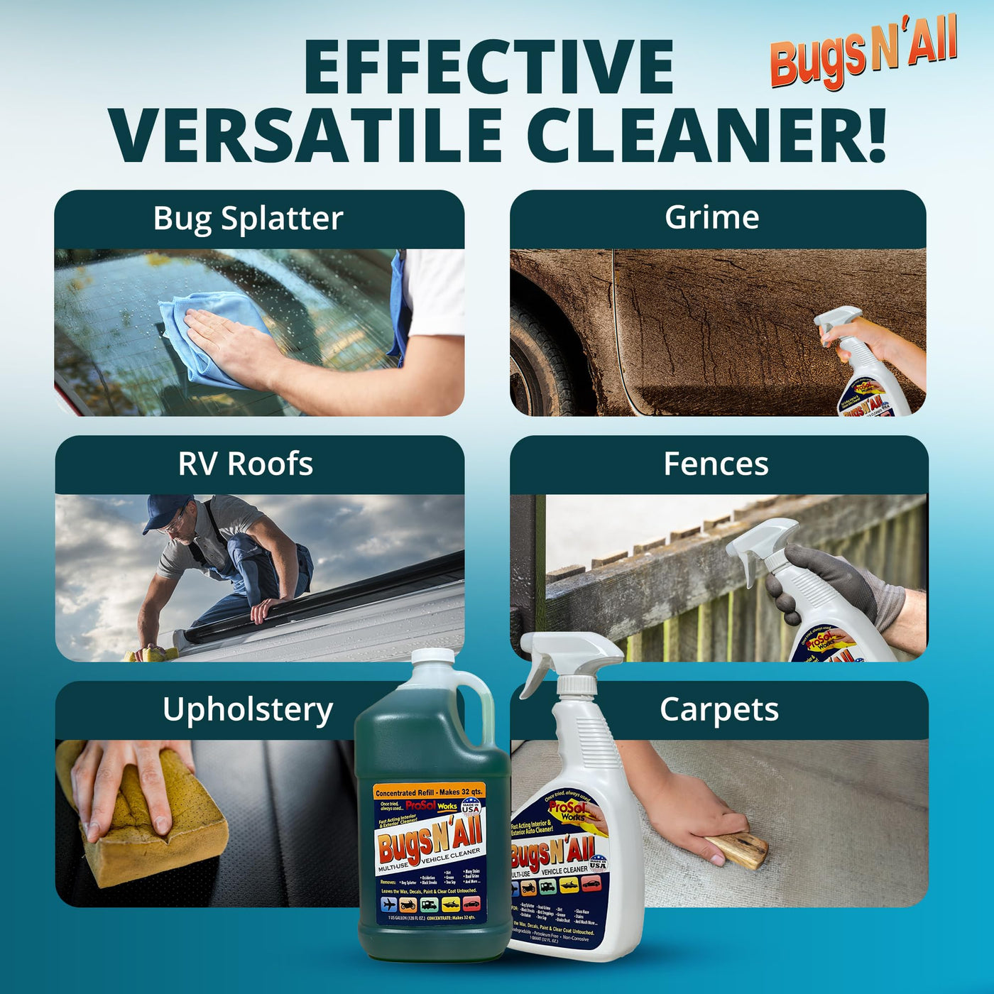 ProSol Works Bugs Splatter N All uses Smart Technology to effectively clean Splatter, Grime and Gunky materials by neutralizing and releasing the acids they contain. What we are saying is Bugs Splatter N All softens Black Streaks and Dried Bug Splatter in about 60 Seconds and releases dirt, grime, grease, and stains in seconds. In addition, Bugs Splatter N All is a tough multi-use vehicle cleaner, yet gentle enough to leave the paint, wax, polish, decals, and clear coat untouched. The power of smart technology inside Bugs Splatter N All is to work harder for you, so you don't have to. Bugs Splatter N All works fast and efficiently so you dont have to. No harsh chemicals, no strong odors, petroleum-free, non-flammable, and most importantly is non-corrosive and non-abrasive. Use Bugs Splatter N All on all vehicles, inside and out. It is tough enough to cut through dirt, grime, grease, black streaks, dried bug splats and a whole bunch more while being gentle enough to clean leathers, vinyl, plastics, upholstery, and carpet. Bugs Splatter N All is a premium automotive cleaner. We guarantee you will love this revolutionary new product. We tell customers that for best results, park the vehicle in a shady area, spray a liberal amount of Bugs Splatter N All on the vehicle. While keeping the vehicle wet with product, wait about 30 seconds, then with a finger or towel, test the releasing process by gently rubbing the affected area. If it comes off like mush, then wash the whole area and you are done. If it took a little effort then wait 20 more seconds or so. The key is to Work Smarter, Not Harder! So let the product do its job. You will love the results.