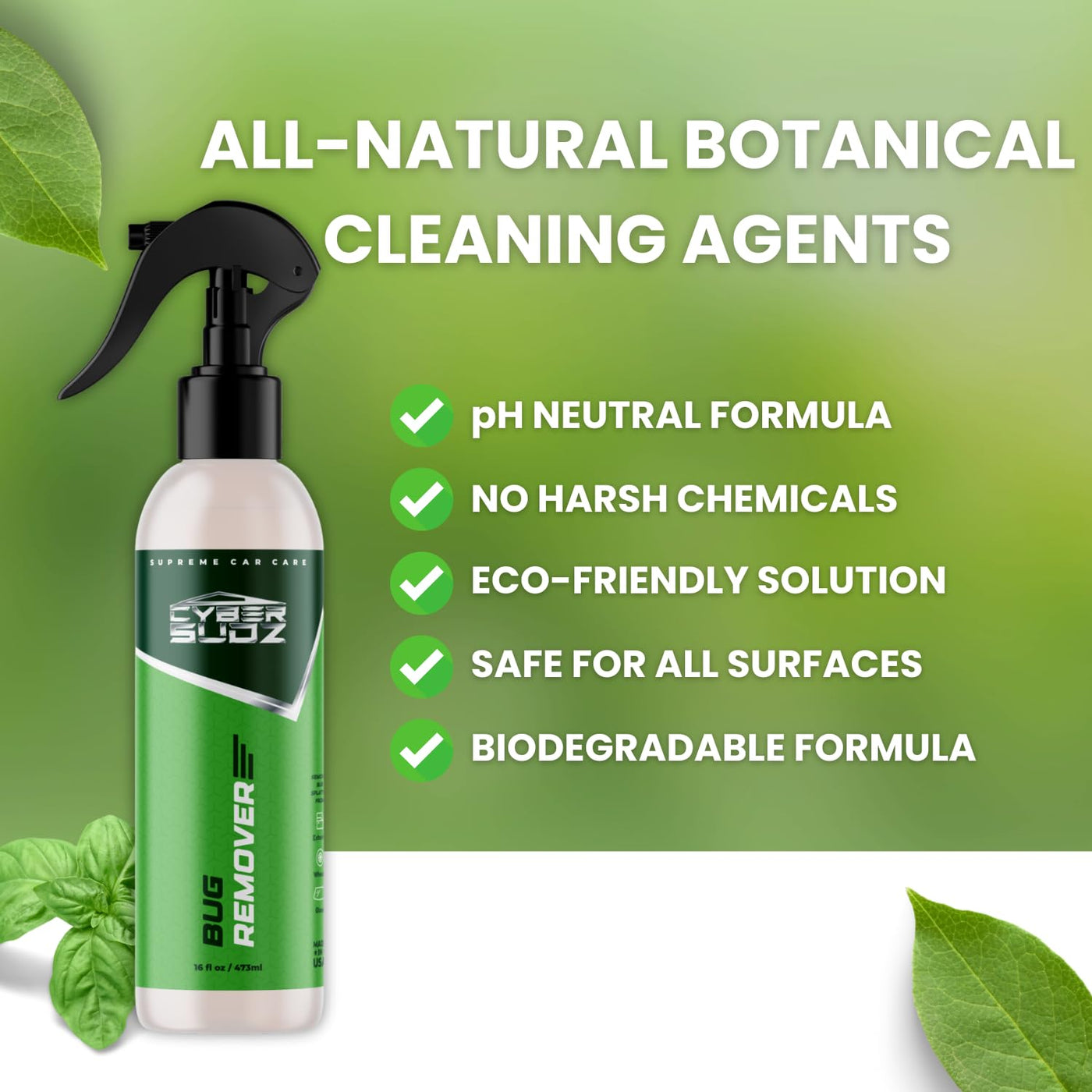 CyberSudZ Bug Remover & Tar Cleaner makes car detailing easy. This powerful formula breaks down and loosens dried-on bug splatter and stubborn road grime without harming your paint, plastic, chrome, or glass. Safe for ceramic coatings and all vehicle types - just spray, wipe, and shine. Perfect for road trips, summer driving, or daily commutes when bug residue becomes a pain. Gentle on surfaces. Tough on the mess.