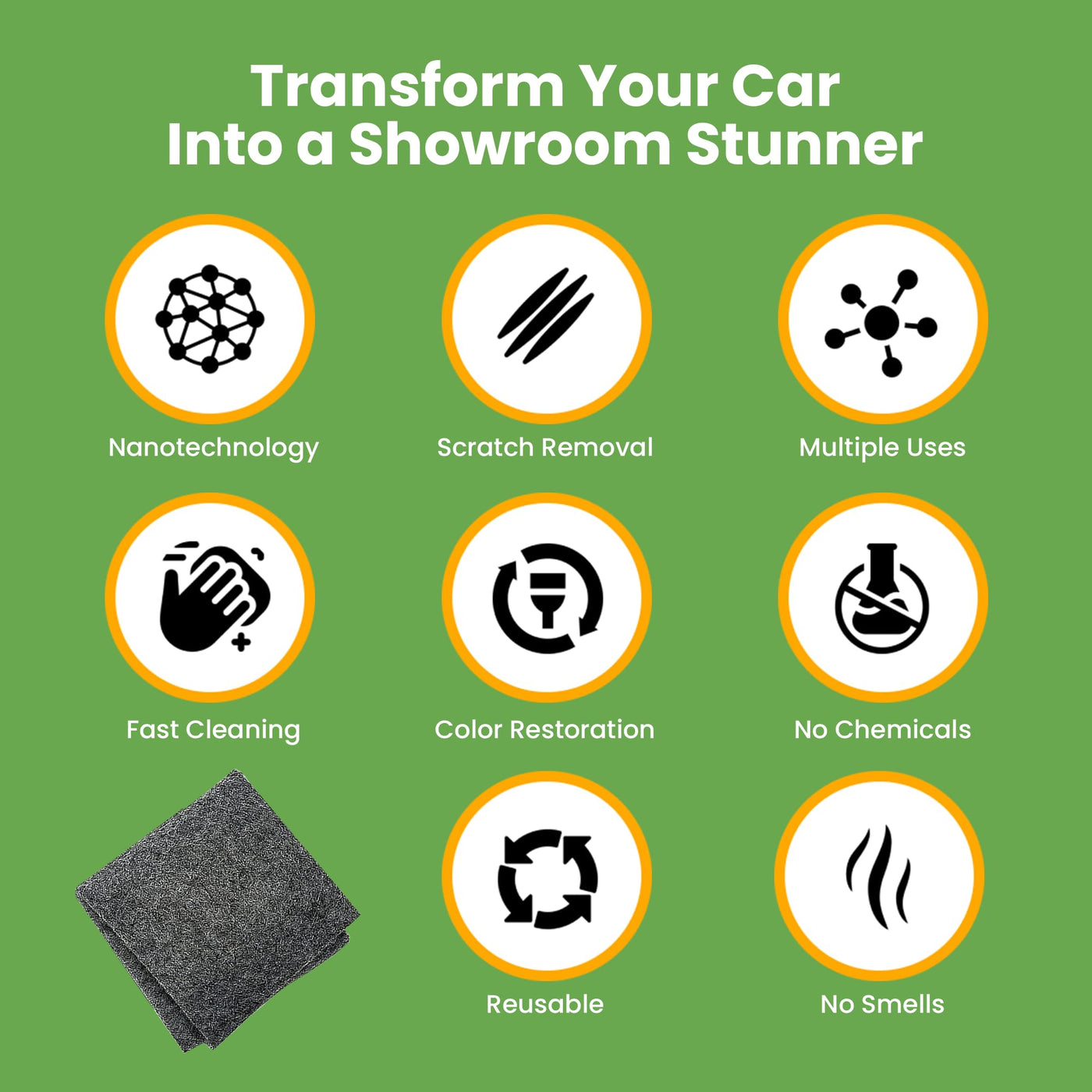 The Breathe Green Nano Sparkle Cleaning Cloth is the ultimate solution for maintaining your car's pristine appearance. Utilizing advanced nanotechnology, this cloth effortlessly removes light scratches, swirls, and oxidation, restoring your car's original shine. The breath green nano cloth scratch remover is the perfect car scratch removal cloth. Its user-friendly design allows you to clean and dry the scratched area, then simply wipe away imperfections with the cloth. Reusable up to 15 times, our eco-friendly product offers a cost-effective solution for car maintenance. Safe for all car colors and finishes, the Breath Green NanoSparkle Cloths ensures a flawless and polished look without causing any damage. It effectively removes scratches, paint residues, and water spots, making it an essential tool for every car owner. Invest in the best and keep your car looking new with the BreatheGreen Nano Sparkle Cloth reviews. With our Breath Green Nano Sparkle Cloth Car Scratch Remover you can clean scuffs, stains & scratches with one simple cloth.
