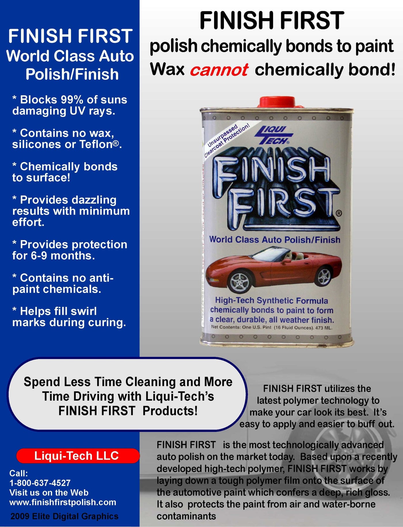 Q: Does Liqui Tech Finish First Auto Polish contain wax, silicone, or Teflon?A: No, Finish First Polish is formulated without wax, silicone, or Teflon, utilizing advanced synthetic polymer technology for superior performance.