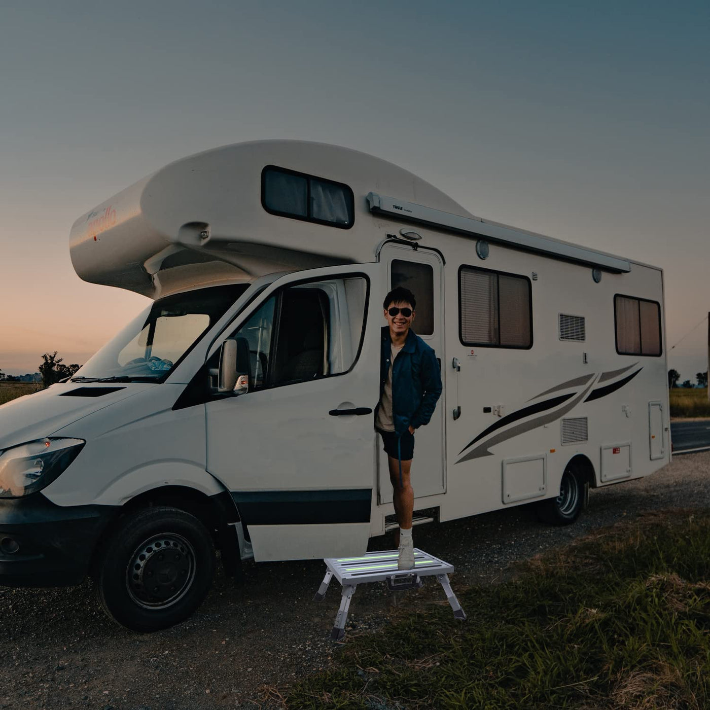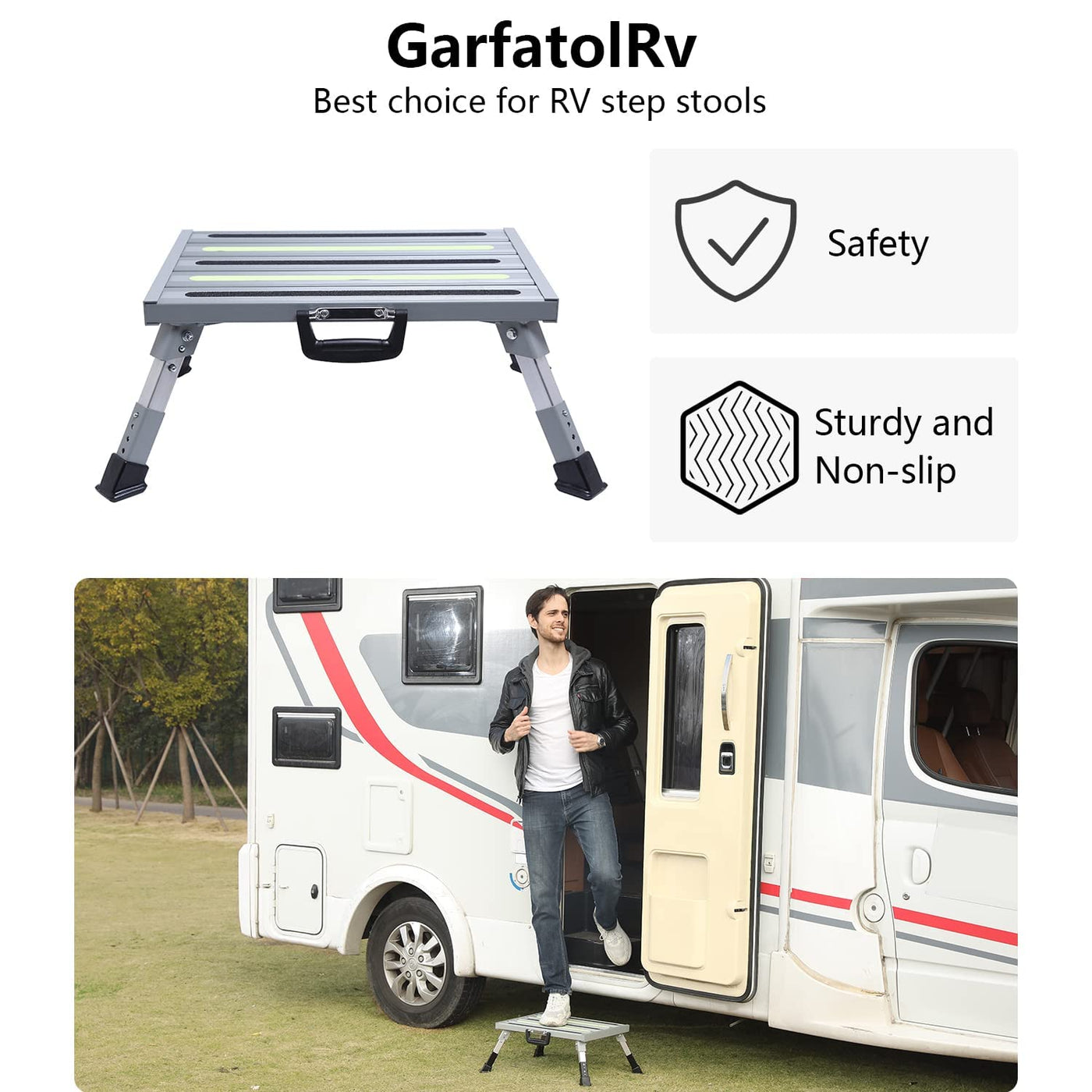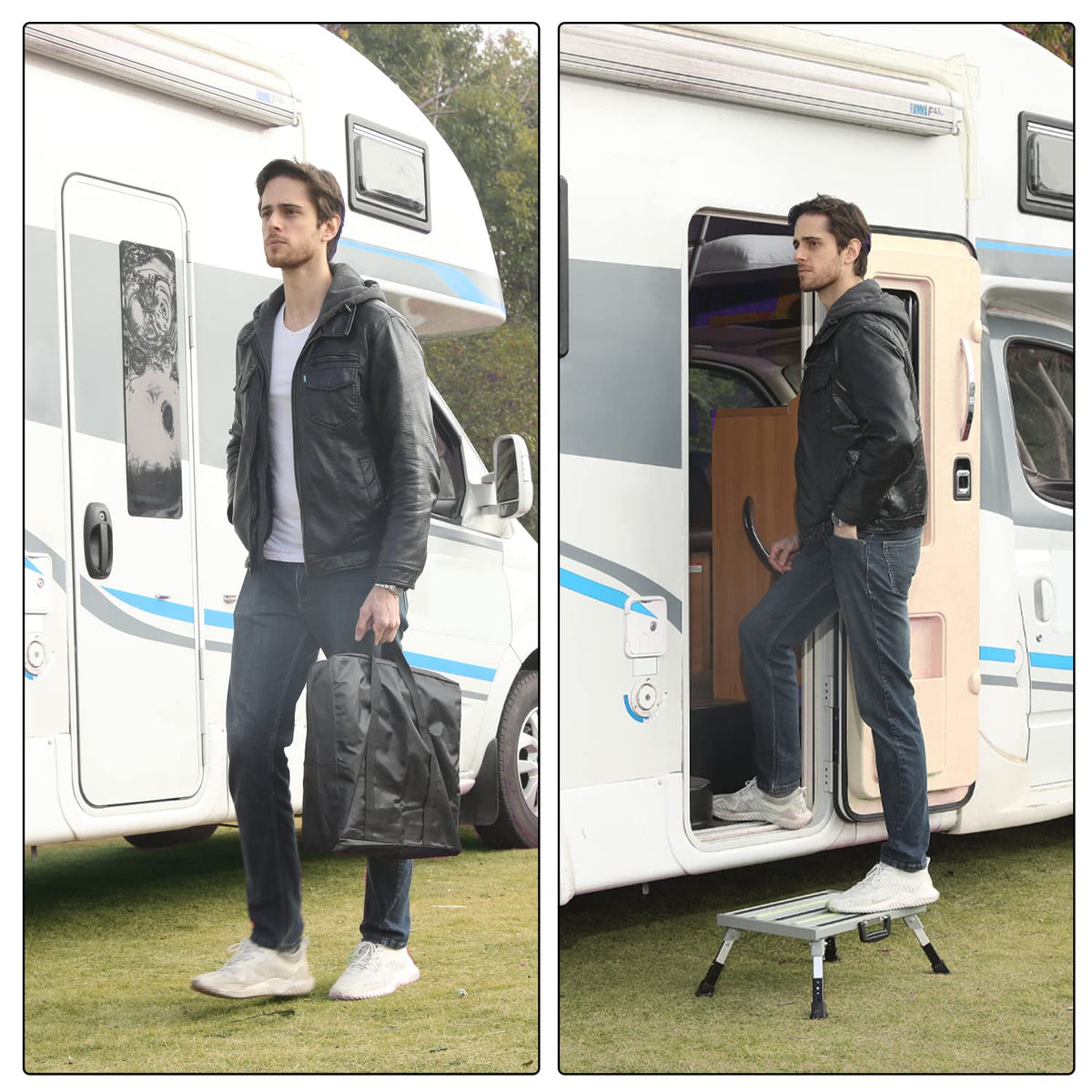 Climbing in and jumping out your RV or Trailercan quickly wear down your body especially after a long day of hiking,so a heavy duty rv folding step will matter especially when youre a senior or have impaired mobility.Why Do You Trust Our ProductWeight CapacityThis adjustable aluminum step has a 1500 pounds weight capacity,which enables it to work well with anyone.Extra Level Of StabilityCombined with anti-slip rubber leg coverings and gripper strips,this step for rv camper will effectively prevent issues like slippingwhen you entering your RV or trailerFoldable And AdjustableUsers can open and close it within seconds,and adjust it into four different height settings (7.5 -9 ) simply bypressing two buttons on each side of the legs.Luminous TapeIt can glow in the dark to improve visibility in order to prevent accidents like tripping from happening.Slotted DesignBuilt to help remove mud or dirt from your shoes, so your dont have to worry about tracking them into your motorhomes.Multiple Practical ApplicationsThis RV platform step stool can come into handy from your garage to your home,or anywhere you might need a stable platform step.Measurements:19 14.5 2.75 (when it is folded)19 14.5 9 (when it is fully extended)