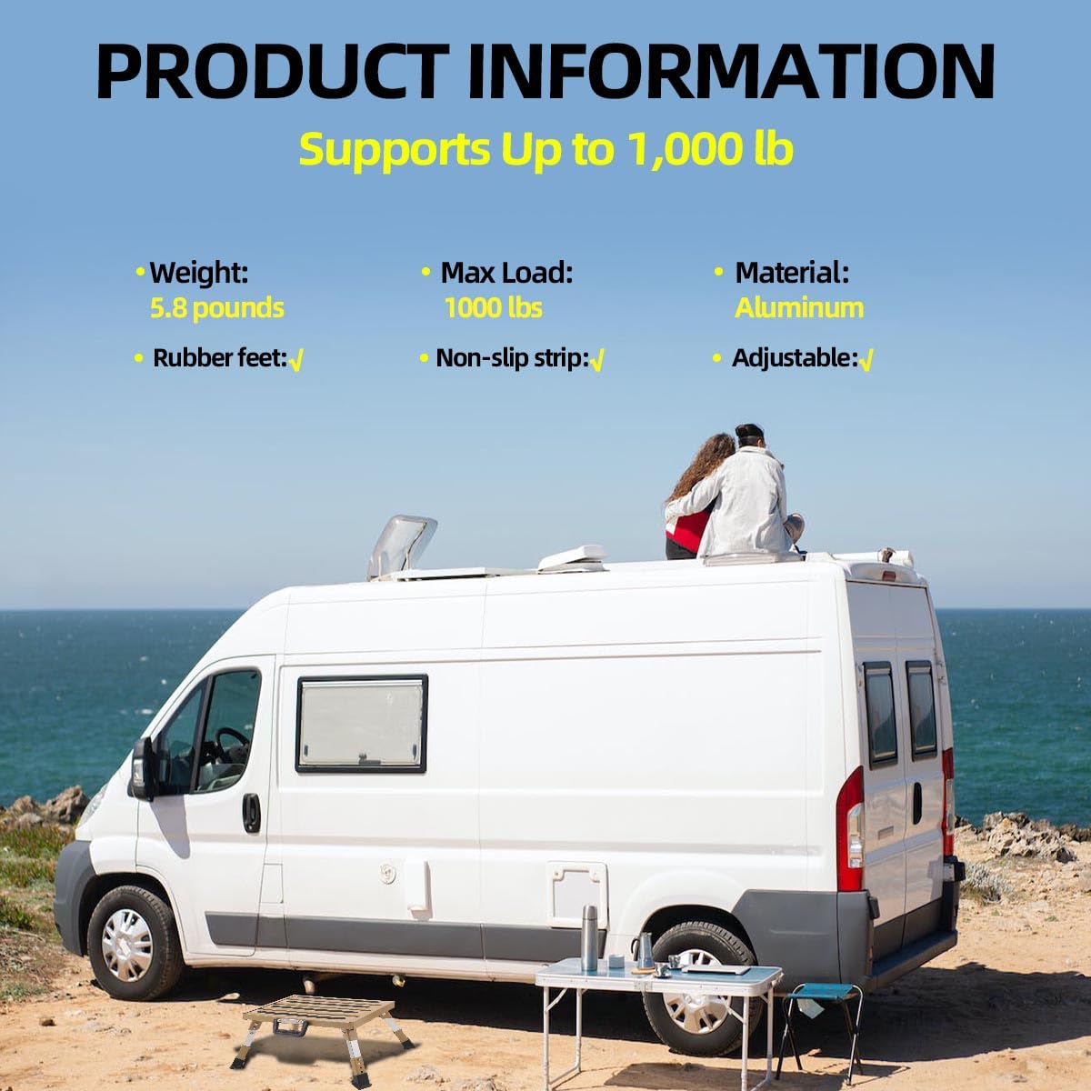 GarfatolRv RV step is made of high quality aluminum alloy, it can withstand high intensity use frequency and complex and diverse outdoor situations, very Sturdiness,the adjustable aluminum step is designed with three slotted strips, you can use this design to rub to remove the mud from your tools and shoes. At the same time it can withstand 1000 pounds of weight.