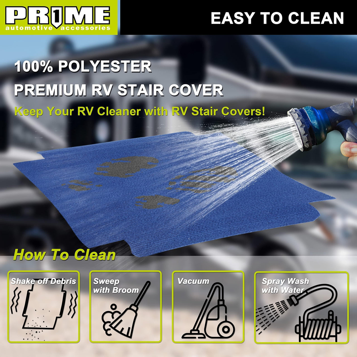 Strong and sturdy aluminum construction with non slip rubber feet. Extra Large Platform Measures: 19 Length x 14.5 Width can provides extra stability for out of reach projects. RV step rugs are made of 100% durable polyester, ensuring a longer service time for the step rug. Can be used in home, garage, to get in and out your vehicle, truck, van, RV, travel trailer, high SUV, motorhome; Also can be widely used in uneven ground such as desert, beach, boat.
