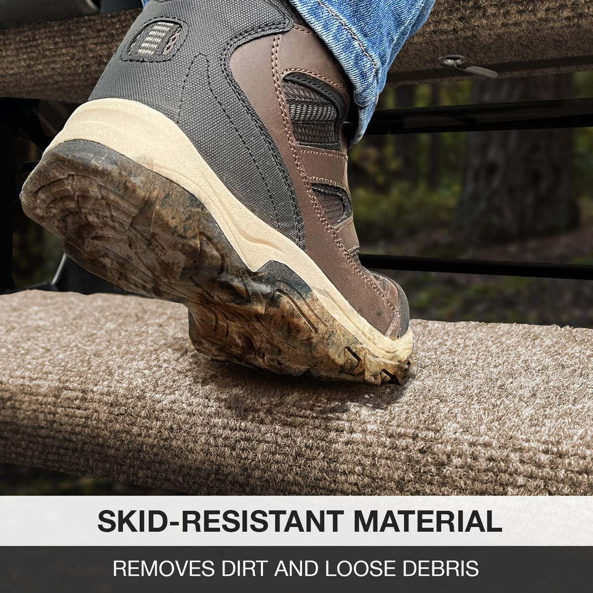 Q: What material is the Prest-O-Fit RV step rug made of?A: The rug is designed with a micro-ribbed texture that enhances traction, providing a safe surface for stepping in and out of your RV.