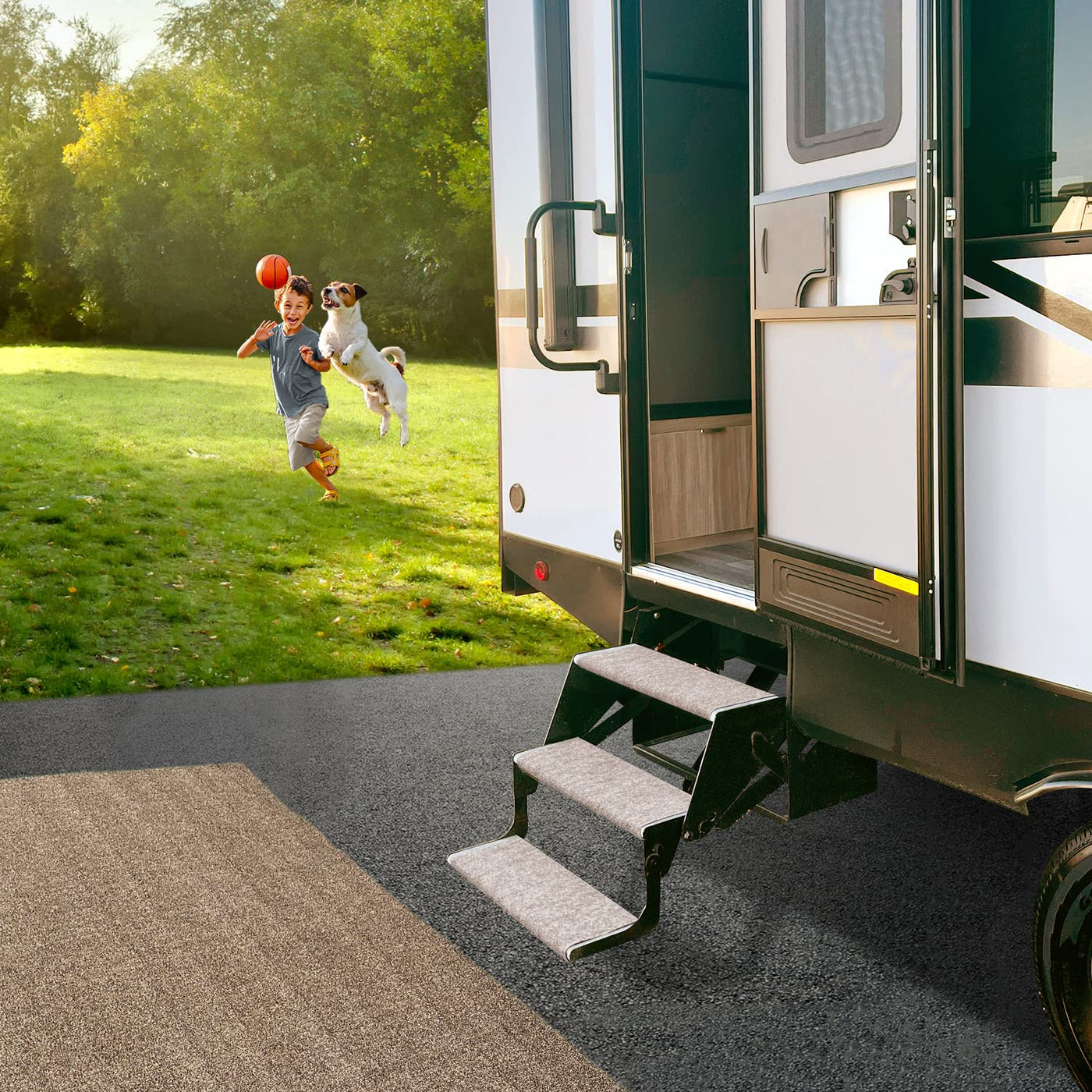 Outrigger's universal RV step rug provides both style and durability. Made with a micro-ribbed texture to provide better traction, the rug is also UV protected and holds up in most any weather condition. No tools necessary for installation. Three built-in grommet holes assure easy adjustment and a smooth fit for most manual and electric RV steps. 23 wide.