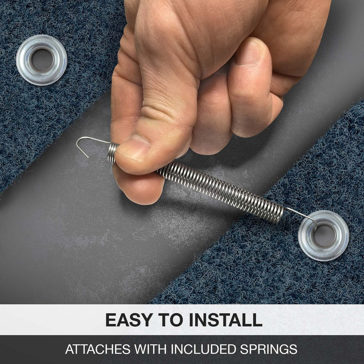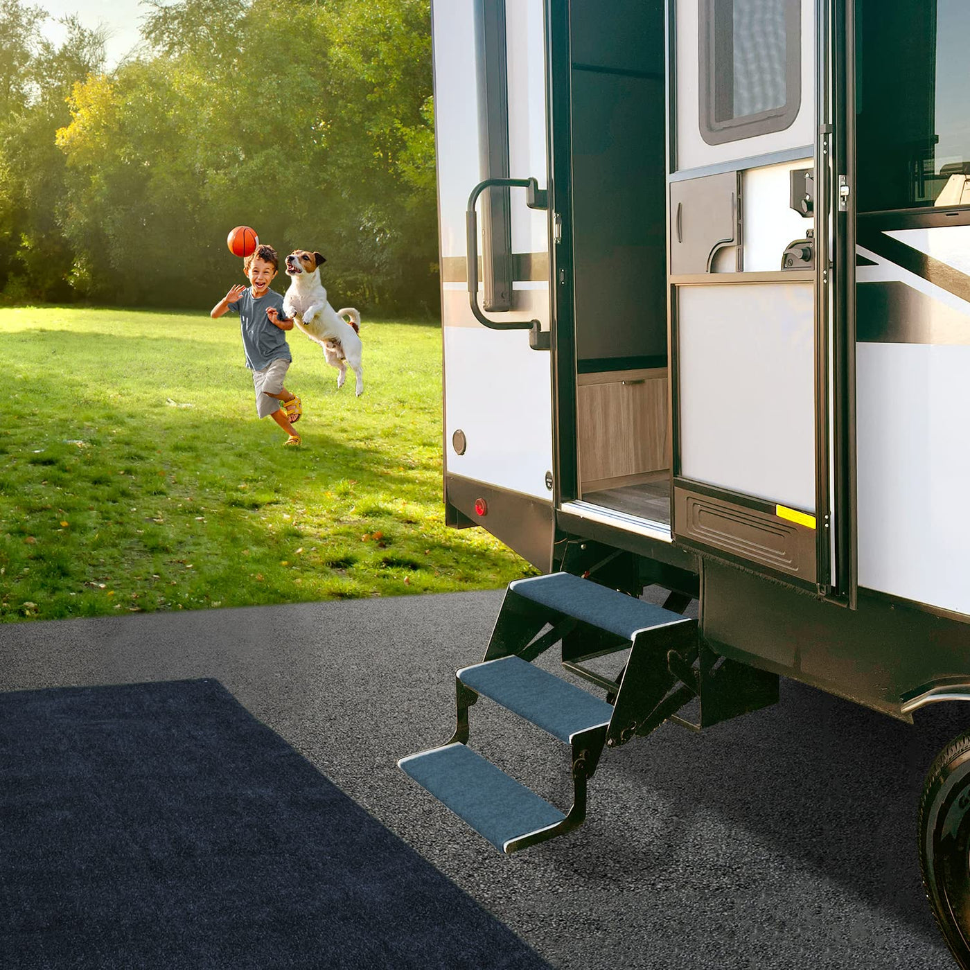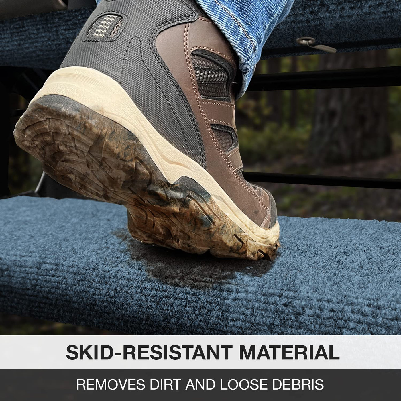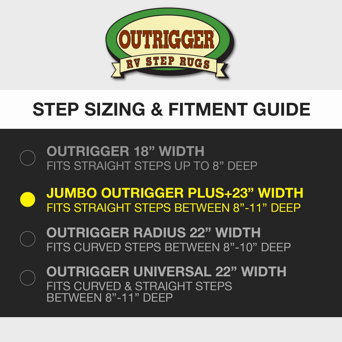 Outrigger RV Step Rugs have a micro-ribbed texture to provide better traction. These step rugs are designed for straight RV steps. Easy to install with included springs fitting manual and electric steps 8 inches to 11 inches deep. Made of olefin carpet that is UV-protected against sun damage and fading. These step rugs are easy to clean, simply hose off and dry.