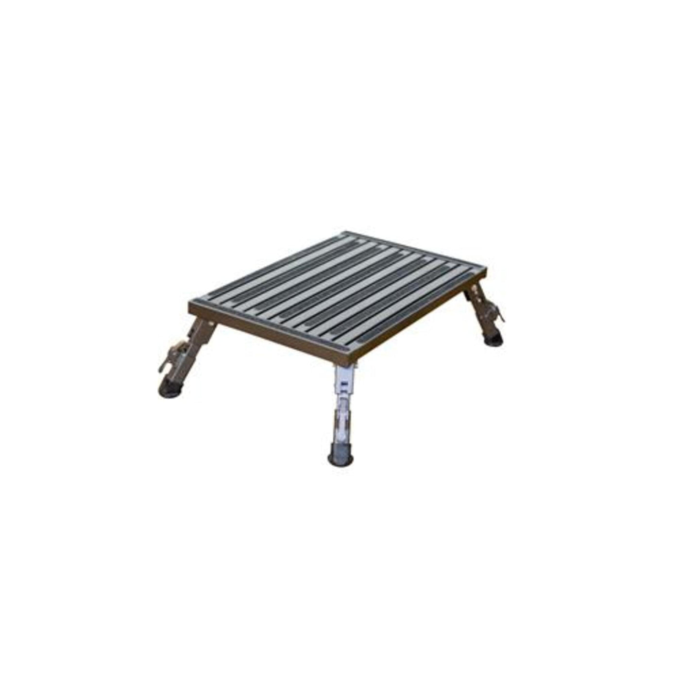 Safest step you will ever own. Large deck with non-skid strips, angled and rubber leg tips to prevent slippage. All aluminum light weight construction with powder-coat finish. Legs individually adjust in 1/2 inch increments from 7 inches to 8-1/2 inches to level, unleveled lots.