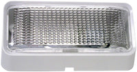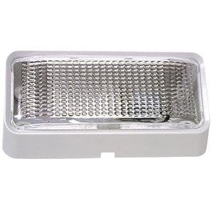 Porch Light White Clear & Amber Without Switch<br><br>Surface mount porch or utility lights are available with colonial white or white bases, amber or clear lens and with or without switch. V385-P contains a 12 volt accessory socket for use with awning lights. Lens snaps securely in place and allows for easy bulb service.