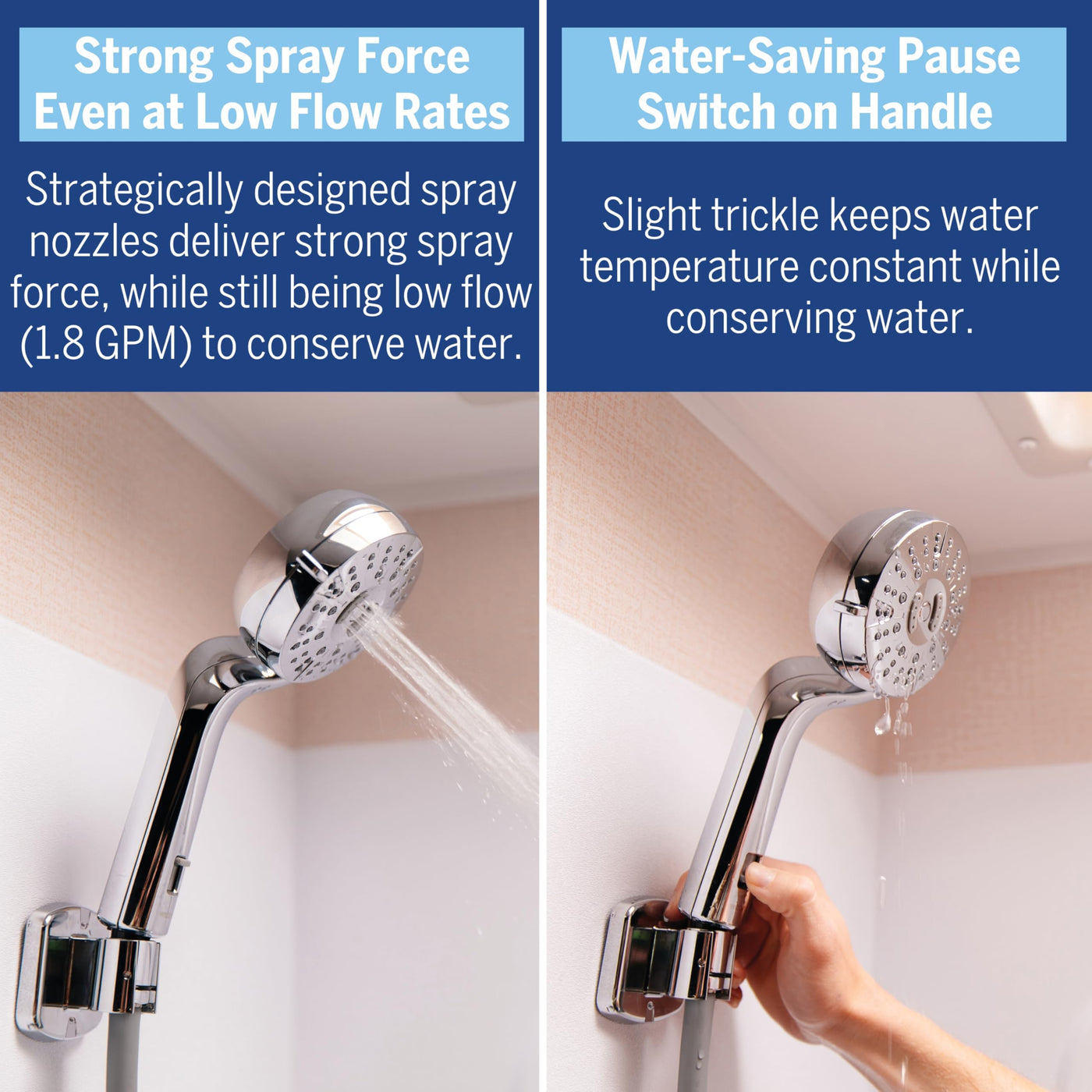 Typical RV shower heads have very limited spray adjustment and can be frustrating to use. With the Waterpik Transform RV shower head, you can customize your shower spray for any angle, thanks to its unique 360-degree pivoting shower head. Use the water-saving trickle switch on the handle to toggle between a full flow spray and a slight flow while lathering up to save water, while keeping water temperature constant. Choose from 5 powerful spray modes including our PowerPulse Massage spray, a revolution in shower head technology that delivers up to 2X the massage force vs. other retail market shower heads. Installs in minutes, and includes a wall bracket with two convenient mounting options (adhesive or screws), 5-foot ultra-flexible hose, and 2 washers