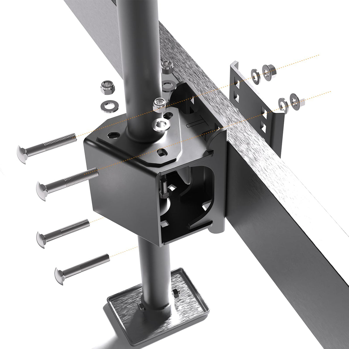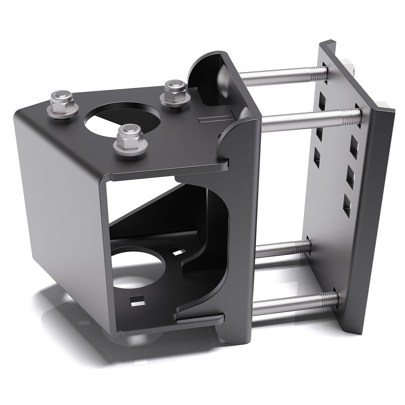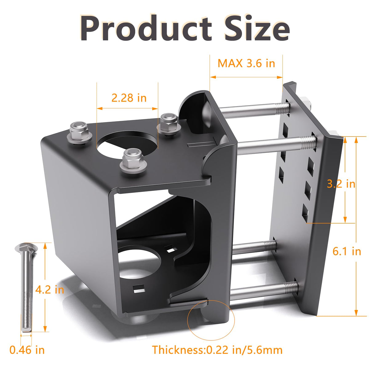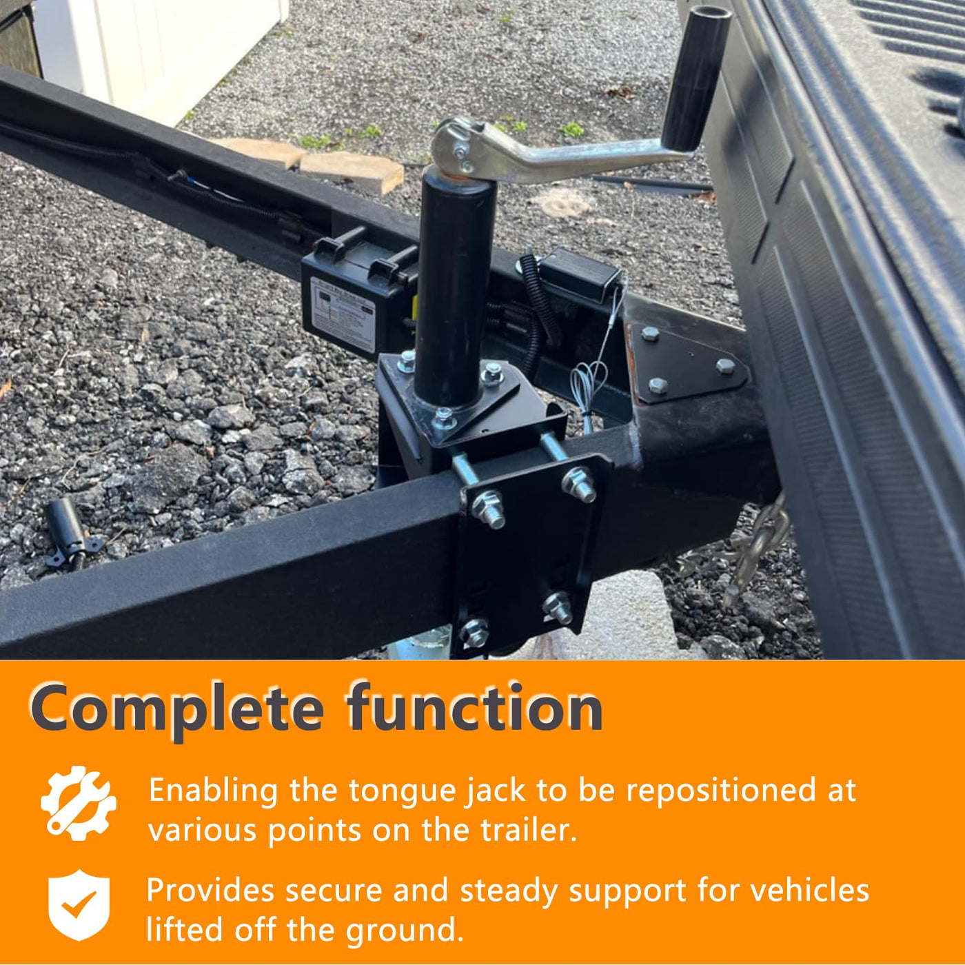 Complete Function: The jack stand bracket kit relocates your trailer's tongue jack. Allows you to move your tongue jack to a different location on your trailer which you want. It can provide stable and secure support for a vehicle that has been lifted off the ground. Once the vehicle is raised to the desired height, the jack stands are placed underneath to bear the weight of the vehicle. Enabling the tongue jack to be repositioned atvarious points on the trailer. Perfect for Tailgating: Provides clearance to open your tailgate without obstruction. You can use that to relocate your jack. Lengthened your trailer tongue and needed to move jack from a a-frame setup to side mount. The bolt pattern allows it to be installed on the sloped portion of the frame. Installing it inside the tongue without welding, having the same sturdiness. You can open your tailgate without it hitting your trailer jack when the trailer is attached. Durable Construction:The jack stand bracket kit made of premium quality steel, it is solid, durable and wear resistant. The surface finish is powder coated to avoid rust and effectively extend the use life.It is heavy-duty, constructed and reinforced very well. Easy to Install:Directly bolt-on. The jack stand bracket fits for square jacks with (2''-3.6'') x 5.5'' square tube, with 5 mounting holes.Yuleimy's trailer tongue jack bolt-on relocation kit compatible with 3-bolt, A-frame style tongue jacks.You had everything buttoned up and relocated in less than 15 minutes. Package Includes:1* Jack stand bracket, 1* Frame plate, 1* Triangular flat plate, 4* Lengthened carriage bolts(fits 2-3.65inches),3* Short carriage bolts,7* Nuts, 4* Flat washers. Yuleimy's Trailer Tongue Jack Bolt-On Relocation Kit allows you to move your trailer's tongue jack to a different location on your trailer. It is perfect for tailgating which providing clearance to open your tailgate without obstruction. This kit is compatible with 3-bolt, A-frame style tongue jacks. It includes a bracket, frame plate and hardware that are easy to install. Product is constructed of durable, powder-coated steel.