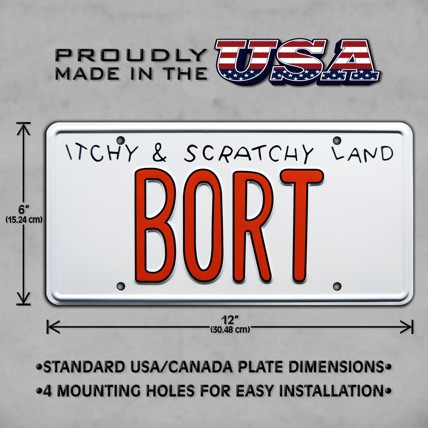 The Itchy & Scratchy Land BORT License Plate is produced as seen on Season 6 Episode 4 of The Simpsons. When Bart visits the gift shop at Itchy & Scratchy Land looking for a Bart personalized license plate, he instead finds one that says Bort. To his surprise, there seems to be many people named Bort and none named Bart.