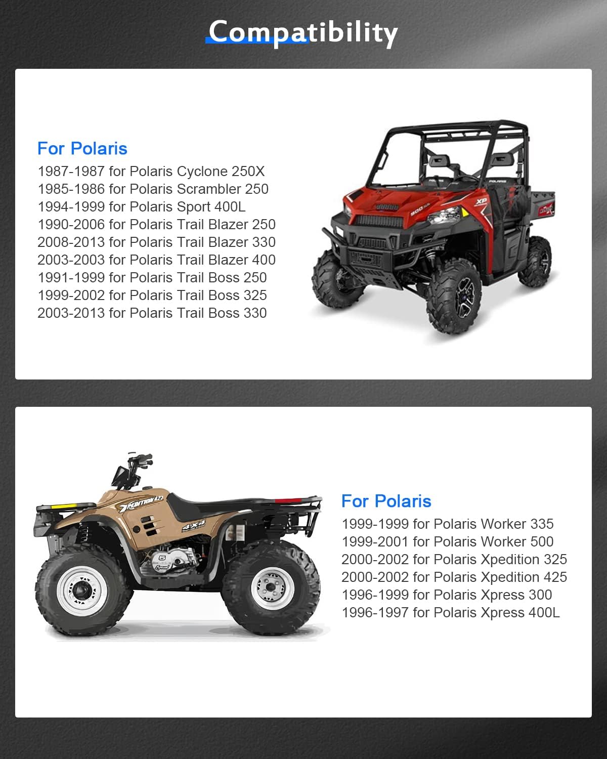 Q: What vehicles are compatible with the ECCPP 4X ATV Wheel Spacers?A: The ECCPP 4X ATV Wheel Spacers are designed to fit EZ GO, EZGO, and Club Car Golf Carts. Always verify your vehicle's bolt count, bolt circle diameter, center bore, and bolt size before purchasing to ensure compatibility.