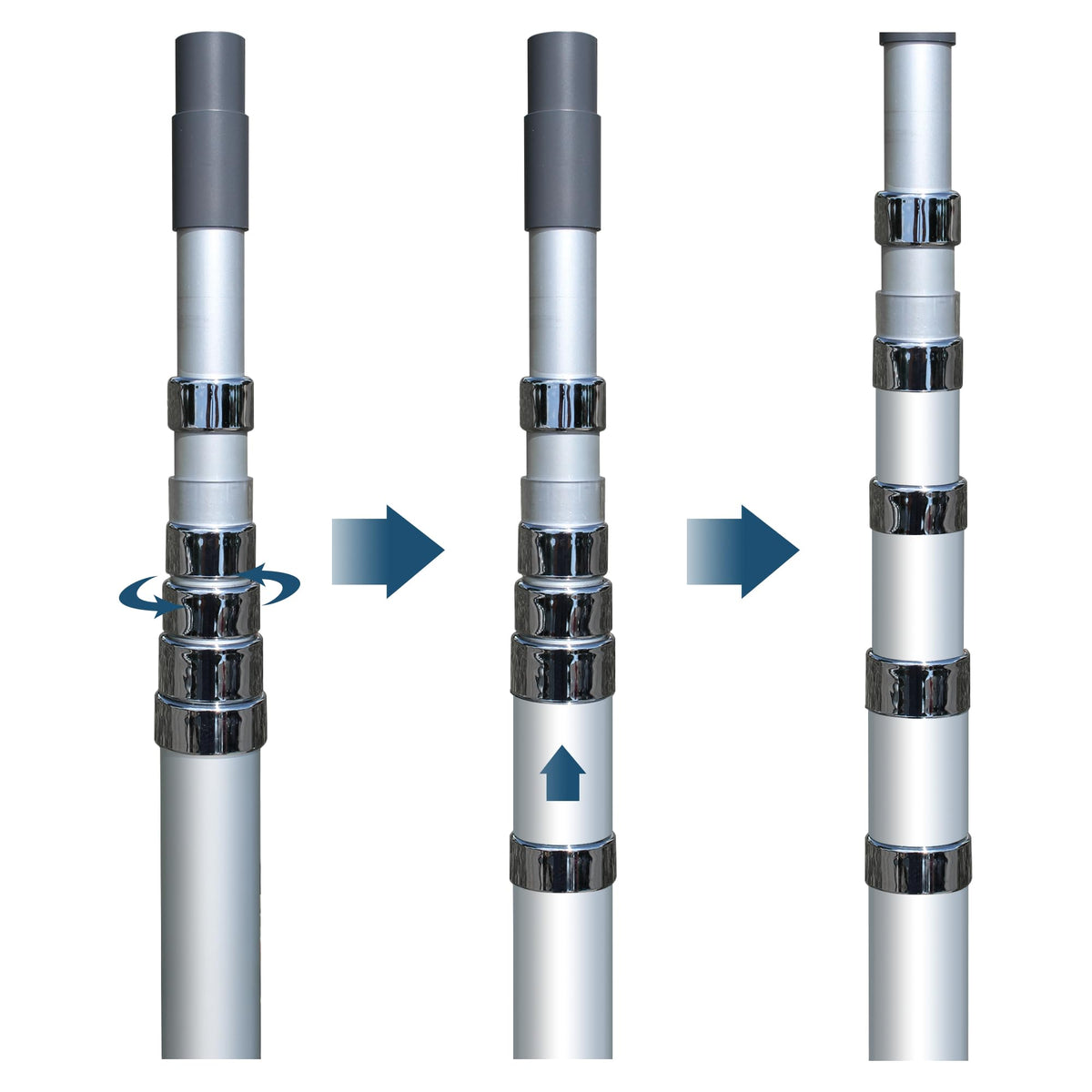 Q: What features make this pole easy to adjust?A: The pole includes a swivel lock mechanism between each section and a push button to lock each section, allowing for easy raising or lowering to achieve your desired height.