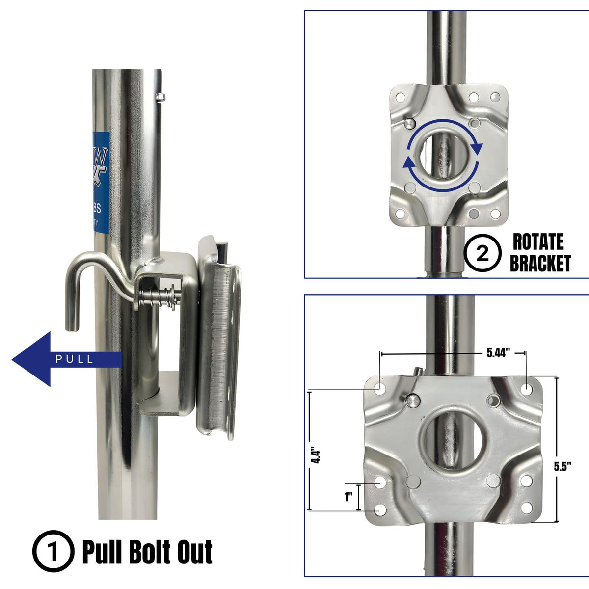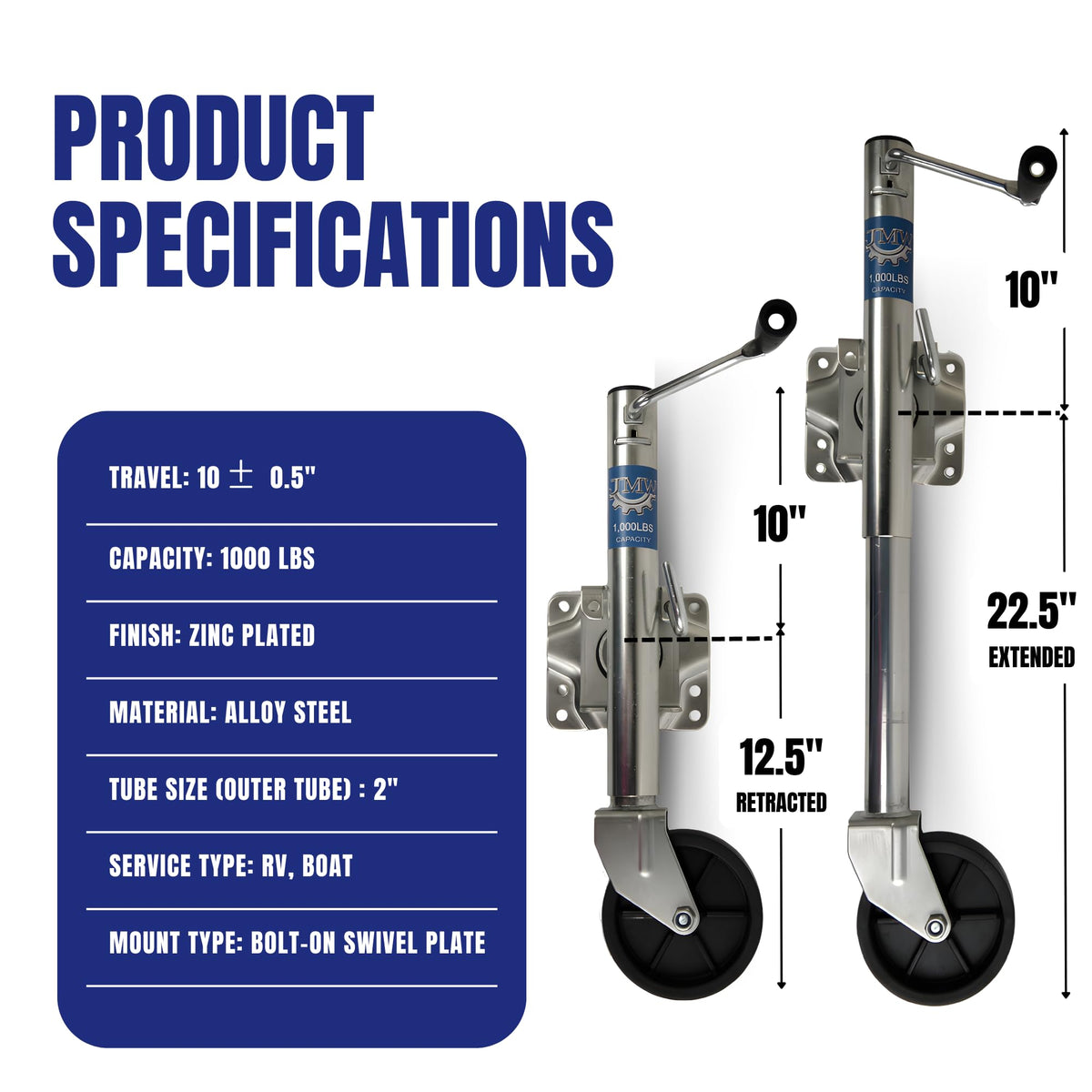 Jack Boat RV Swing Away Camper Wheel Bolt On 1000 LBS Capacity Trailer Side Swivel Transporter Parts 1000 Lbs Trailer Side Swivel Jack Material: Q235 Steel, Galvanized Capacity: 1000Lbs Handle Style: Side Wind Dimensions: 10? Extended Height, 6'''' Wheel Diameter Includes: 1 Side Mounted Swivel Jack With Hardware
