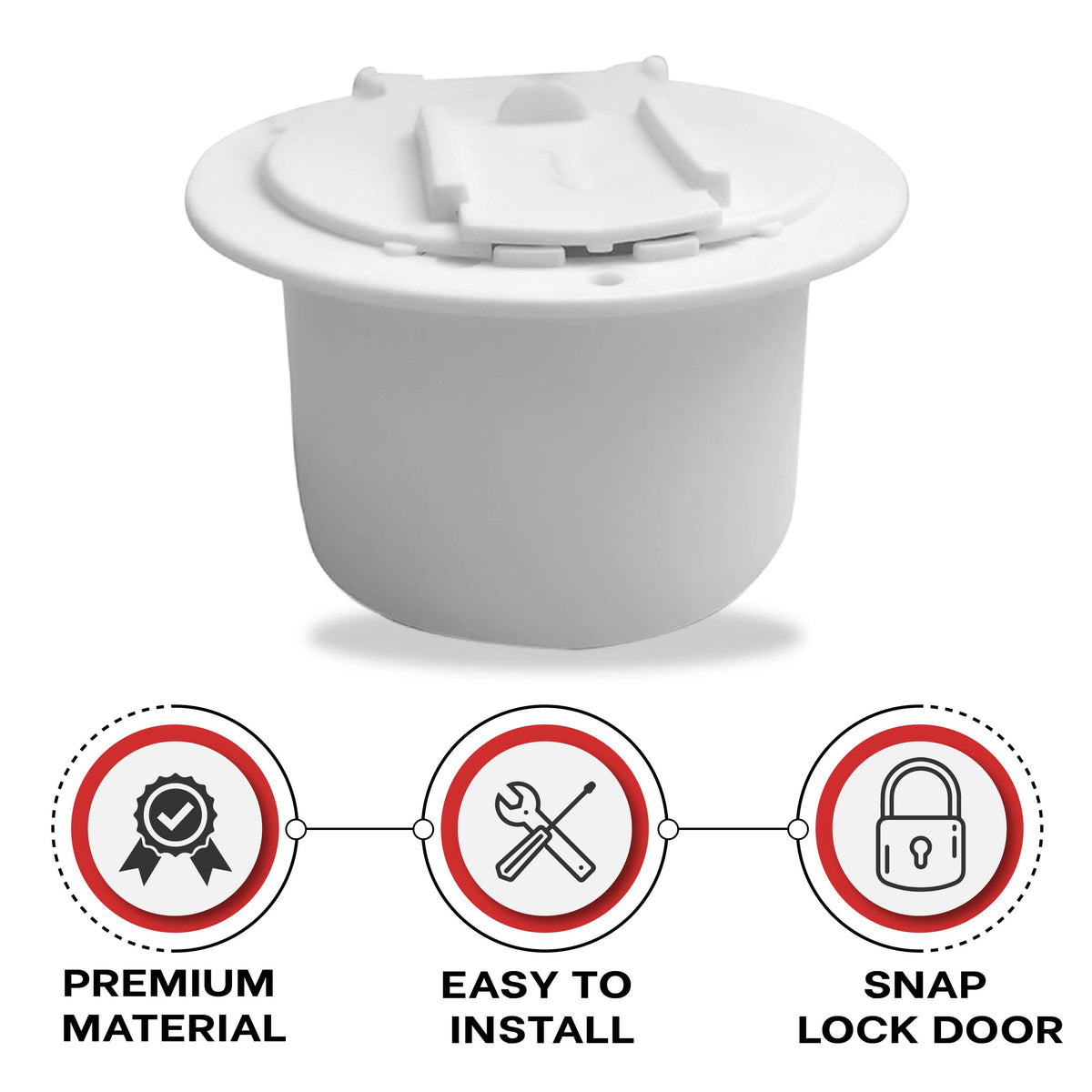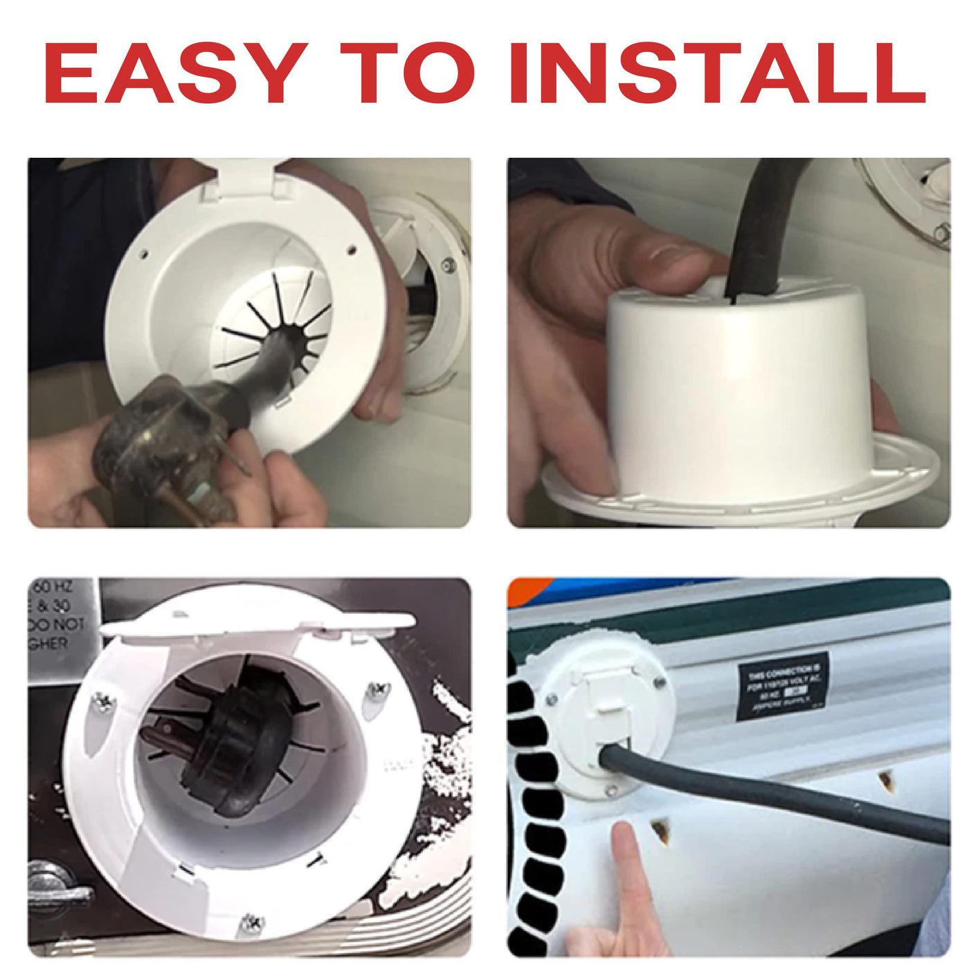 1 Brand New RV Camper electric cord cover / hatch. The color of this hatch is white. It is made with plastic, and UV stabilizer is added so the color won't fade easily. This hatch come with snap lock door, and will accept up to a 50amp power cord. The inner diameter is about 3-1/4'' and the outer diameter is about 4-1/2''. The opening on the door for the power cord is about 1''.