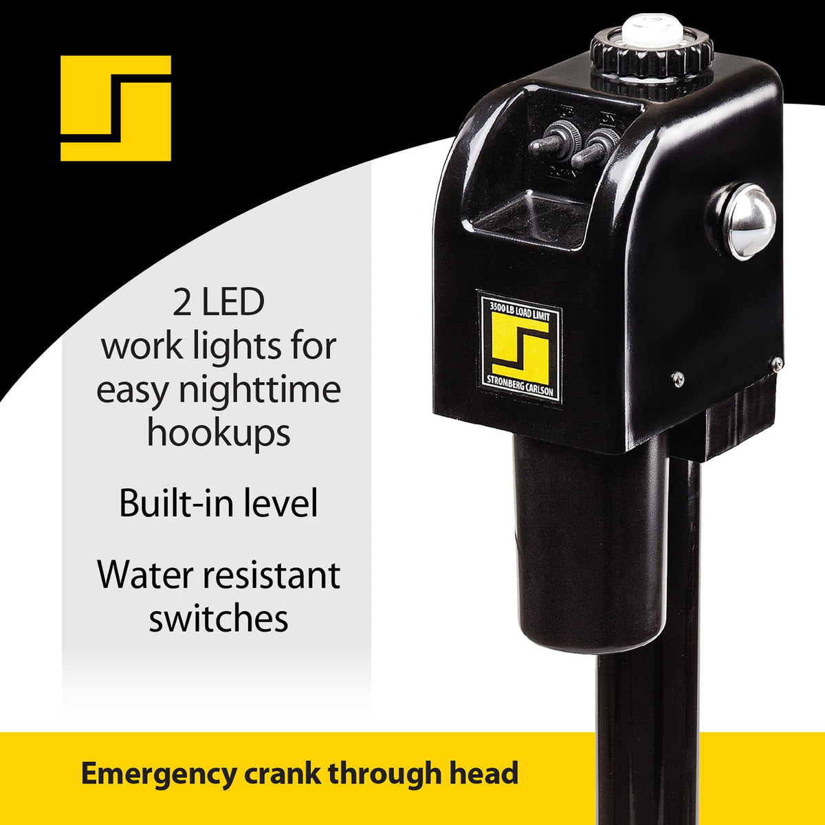 Q: Are there any lighting features included with the Stromberg Carlson JET-3555?A: Yes, the jack is equipped with dual LED work lights that enhance visibility during nighttime hookups, making it easier to operate your RV or camper in low-light conditions.