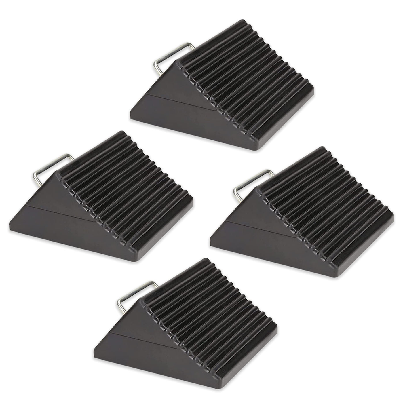 Have you tried cheap plastic chocks that slip, crack or require pounding? AFA Chock Blocks have an aggressive ribbed design that grips your tires fast to give you the confidence to park on any downhill grade - or to use with wheel ramps on slick garage floors without fear of crushing. Just kick em in place and walk away thats it. Heres what you get: - 4 Wheel Chocks (2 Pair) enough for front and back of 1 axel. - Nylon reinforced rubber thats 2-times stronger than old rubber designs that rip and tear. - Chock Blocks that won't crack, chip, slip and slide like cheap plastic options. - Wheel chocks that stand up to sun, sand, snow, mud, dirt, dust, and ice. - A textured bottom and ribbed top that grips your tires without the need to hammer or pound them into place. As you check out the pictures you'll notice the compact design. At 8 x 3.5 inches, with a 4.5-inch height, your Chock Blocks are small enough to toss behind the seat, yet tall enough to stop any sized tire from rollback (even truck tires). Also, notice the beefy handles. Unlike cheap options with eyebolts (that rust and bend), this large handle is made for easy grabbing, with extra room to tie your Chock Blocks together using rope for quick pullouts. Your order ships with 2 pair of dual wheel chocks that are perfect to keep your RV, Camper or Trailer in place while your away. But dont take our word for it... Toss a pair of Chock Blocks under your car, truck, trailer, ATV, or RV tires, and join customers who say Chock Blocks give them the confidence to park on any incline, and in any weather with complete peace of mind that their wheels will stay put. Our wheel chocks for travel trailers are the perfect camper blocks and wheel stopper that you are looking for! Also applicable as wheel chocks for boat trailers. These trailer chocks are the perfect camper wheel chock!