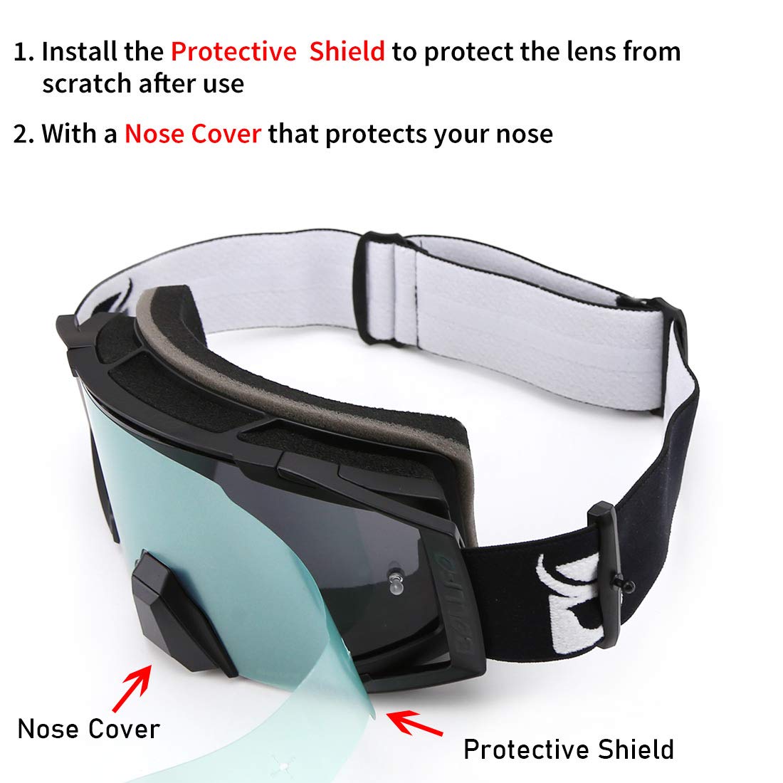 ?SUITABLE FOR MOST PEOPLE? If any with the goggles, please let us know via ORDER PAGE DIRECTLY, We Supply 180 days replacement supports. The anti-slip and elastic strap can fit head size of women, men, youth, or kids. | ?FIT OVER GLASSES & HELMET?With the adjustable anti-slip and elastic strap, the goggles can fit over helmet. With soft padded breathable foam inside, the goggles can fit over glasses. | ?COMFORTABLE?These dirt bike goggles have soft padded breathable foam for comfortable wearing and the vents on the top for heat dissipation and anti fog. And super lightweight: 3.52oz | ?ABSOLUTELY SAFETY? Enhanced PC Lenses and ABS Frame. Multi functions: The motorcycle goggles with impact-resistant colored PC lens against wind, dust, dirt, rain, snow, sunlight and UV rays to protect your eyes safe and with nose cover to protect your nose in any outdoor sports! | ? ?Replacement within 12 Months?If any issue, no matter what cause it is, replacement available within 12 months.So feel free to get your goggles