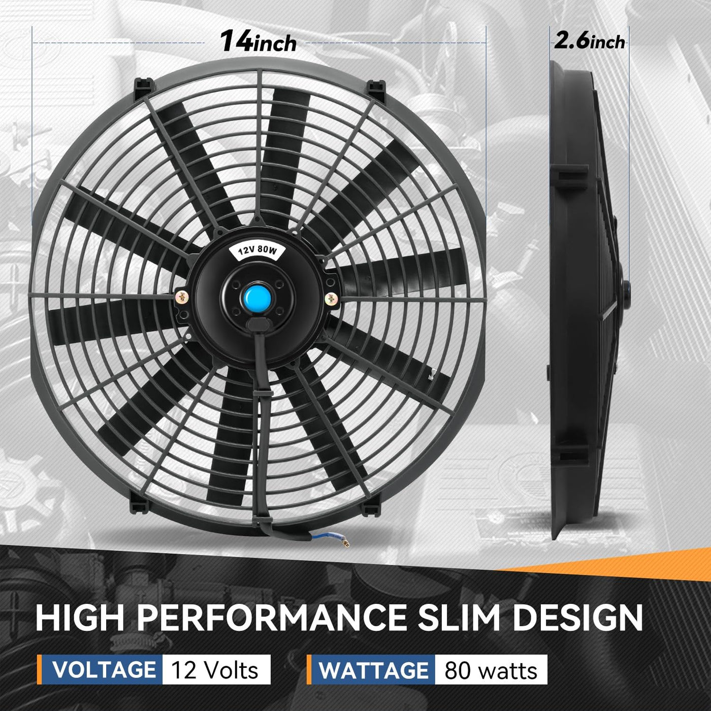 Auto Dynasty Universal 14 Inches High Performance Electric Slim Radiator Cooling Fan With Mounting Kit, (Pack Of 2) 12V, Black