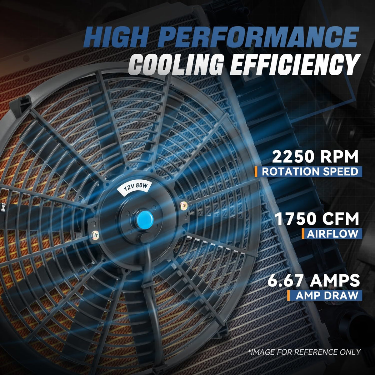 Just like other major components in the car, the radiator cannot work on its own. It has supporting parts that help it perform its function more efficiently. In order for the radiator to reduce temperature of the water and coolant mixture that goes through the engine, it needs airflow that absorbs the heat and assists evaporation. Radiator fans are used to draw the air towards the radiator and help in the cooling process. High Performance radiator fans may be used to replace your OE product for more efficient cooling. They allow more air to circulate around the radiator and they need less horsepower to operate too, making them ideal for your radiator fan replacement. Radiator Fans come with ultra slim design so the fan can be installed easily against your radiator, in the most convenient position to allow for more leniencies for other aftermarket parts.Package Included:2 x Radiator FanMounting Straps X 4Strap Locks X 4Mounting Pads X 8Tension Springs X 4All Necessary Application Hardware