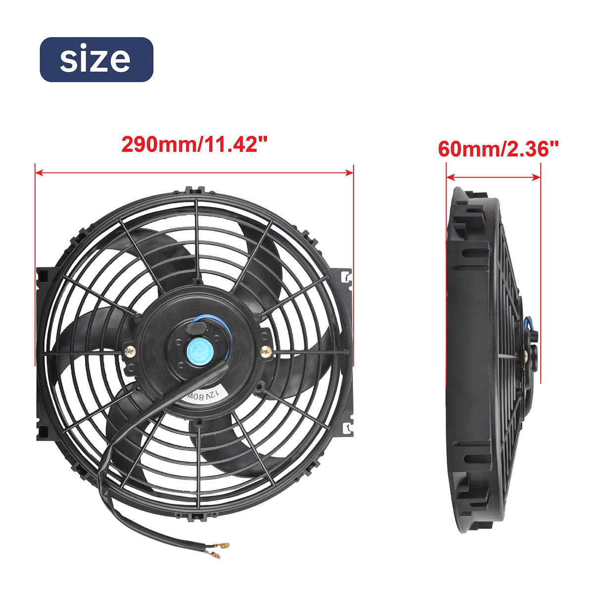 Description:10 Inch Electric Radiator Cooling Fan100% Brand New Items, Never Used Or Installed.Blade Material: PlasticColor: Black12V, 80WNumber of Blades: 6 bladesMaximum Fan CFM: 800 CFMMaximum Fan RPM: 240010% RPMFan Diameter: 10Thickness: 2.36Amp Draw: =6 AmpsAids to cool the entire engine bay, including radiator, A/C system, intercooler, oil system, and transmission.Slim design provides excellent engine bay clearance for engine modificationHigh quality lightweight plastic durable material Direct bolt-on installation, requires no modificationOE fitment or replacement, push or pull typeProfessional Installation is Highly RecommendedNo Instruction IncludedThermostat Kit:Activates by grounding electric fans at preset temperature.180'F turn-on temperature, 165'F turn-off temperature.3/8 NPT thread-in brass probe w/ 1/2 NPT adapter included.Probe typically threads into radiator, water outlet or manifold. Puller and Pusher DesignPuller fans mount on the engine side (back) of the radiator core and pull air through the radiator core. The fresh airflow is pulled through the grille, then pulled through the core, and exits out the back side of the radiator. Puller fans are the desired and most common way of mounting a fan when space is not a limitation between the front of the engine and the back of the radiator core.Pusher fans mount on the grille side (front) of the radiator core and push air through the radiator core. Fresh airflow enters through the grille, then is pushed through the radiator core, and exits out the back side of the radiator. Pusher fans are used typically where there is a limited amount of space for a properly sized puller fan.Package includes: