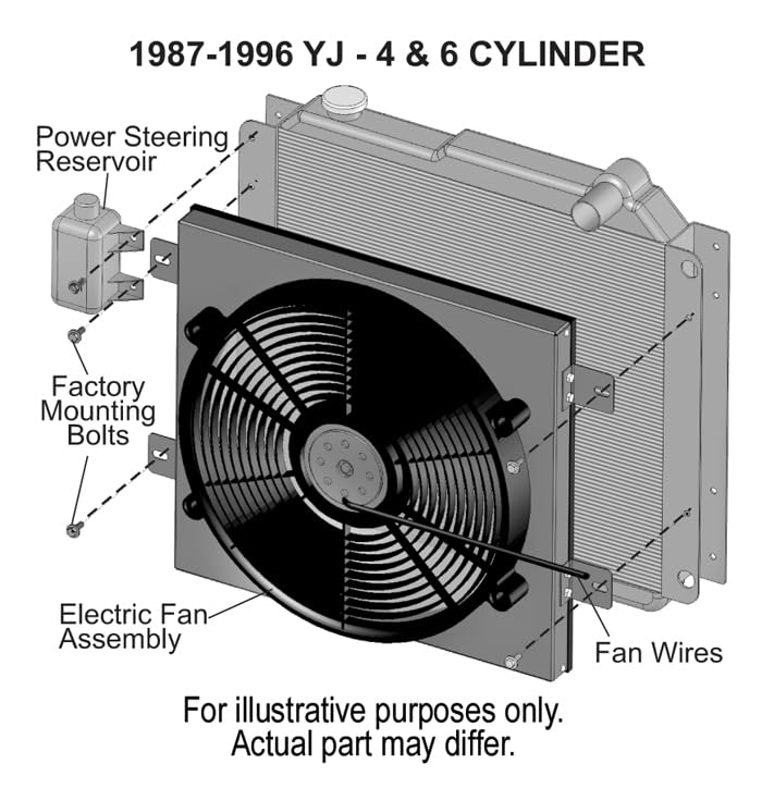 This direct fit electric cooling fan assembly is the same as all of our products: the kit comes complete from the factory without the need to spend extra on necessities such as power steering reservoir brackets or coolant recovery tank brackets. Everything you MIGHT need is included, except of course the tools. Leave your drill in your toolbox, you won feett need it here. We take a thermostatically-controlled high performance 17 inch skewed blade electric fan motivated by a 265 watt Bosch motor and a black powder coated, laser-cut heavy duty metal shroud, along with all necessary brackets, fittings, relay harness, and mounting hardware to create the ultimate direct fit electric fan on the market. Fits ALL 4 and 6 cylinder Jeep Wrangler YJ's and TJ's.