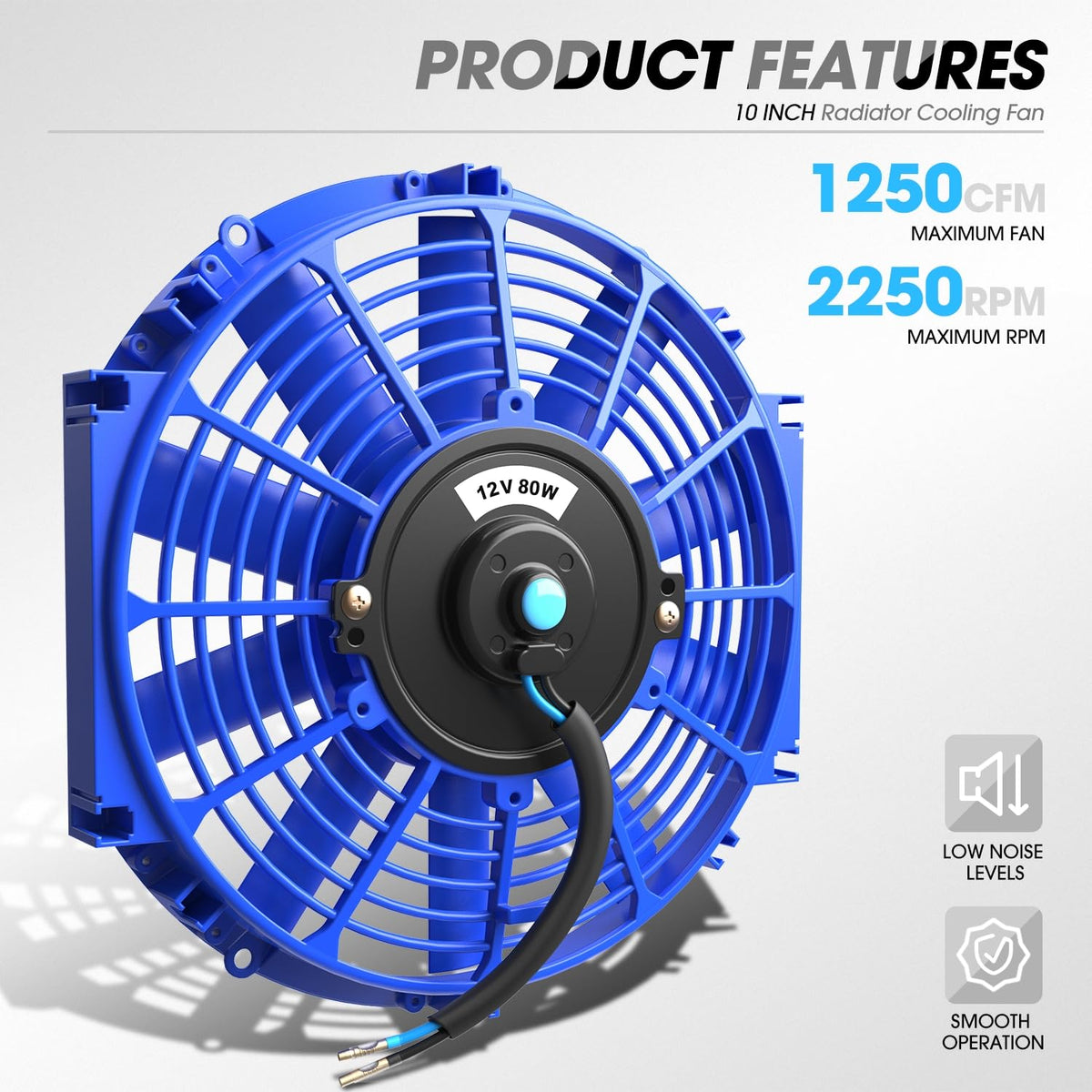 Push/Pull: High Efficiency Slim Radiator Fans; OE Fitment or Replacement, Push or Pull Type | Slim Style: Slim Design Provides Excellent Engine Bay Clearance; Brings More Space for Engine Modification | High Performance Design: Performance JDM Spec. Racing Design; High-quality Lightweight Plastic Durable Material | Application: Aids to Cool the Entire Engine Bay, including Radiator, A/C System, Intercooler, Oil System, and Transmission | Easy Installation: Includes the Mounting Tabs for an Easy Zip Tie Installation