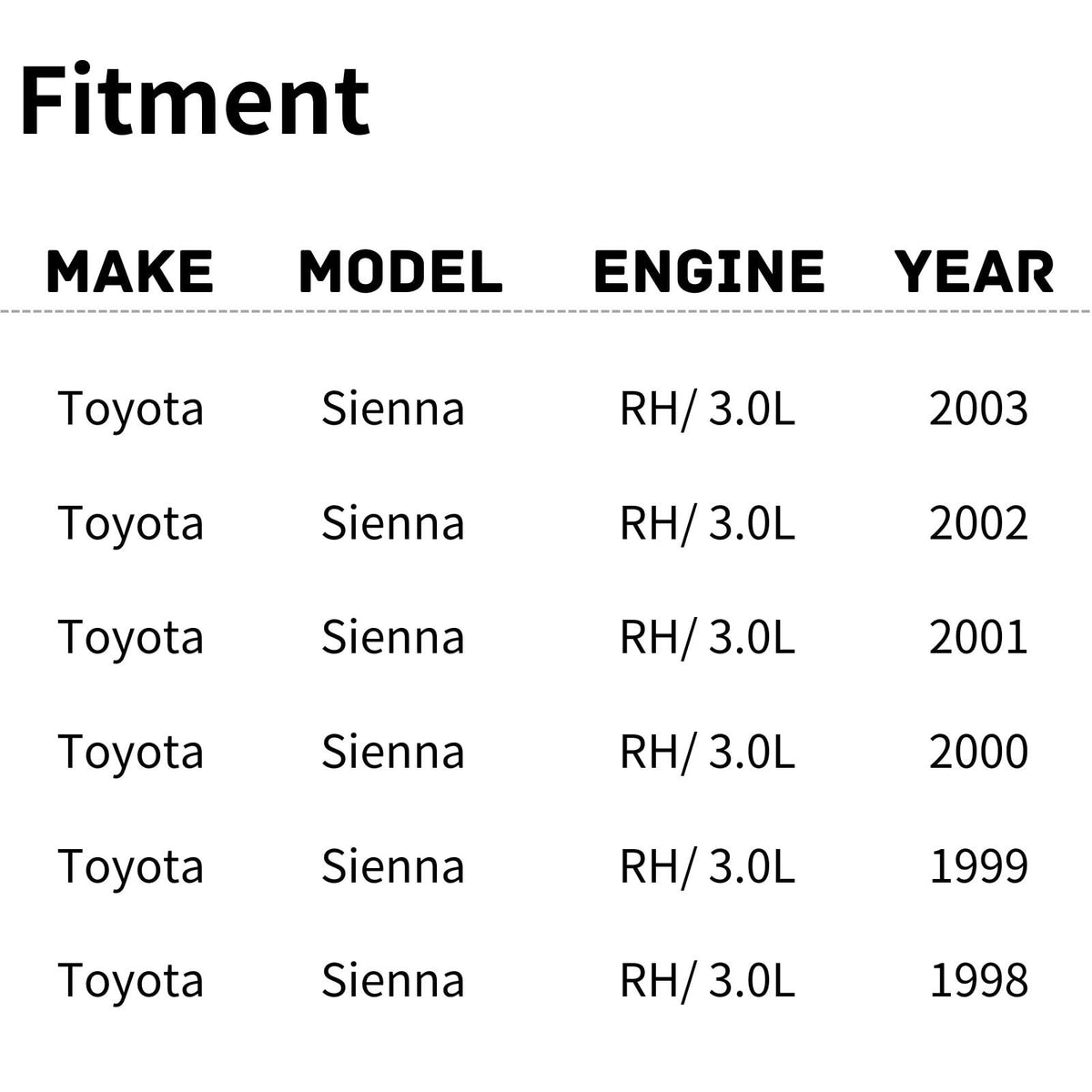 Replacement Radiator/Condenser Cooling Fan Assembly For Toyota Sienna 98-03 RH/ 3.0L (Right Passenger Side), Partslink Number TO3115126, OEM Part Number: 16363-20060, may have alternate model fitment.