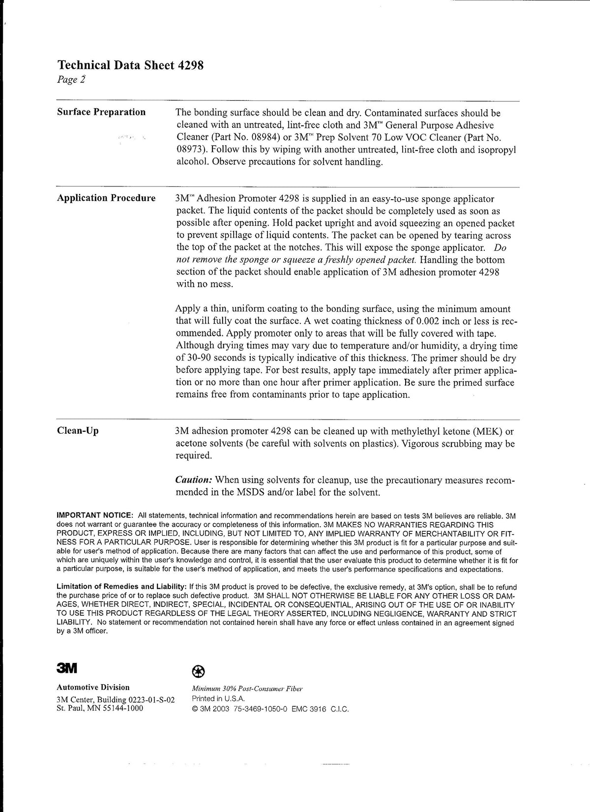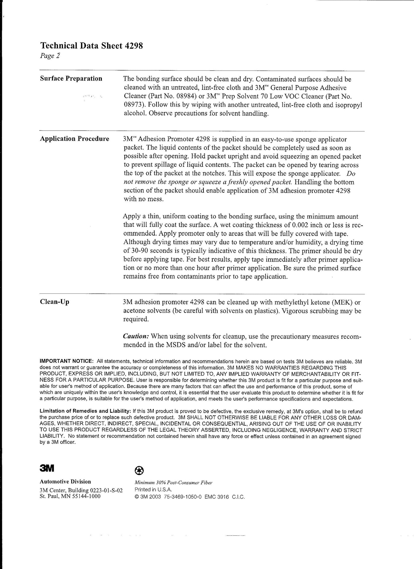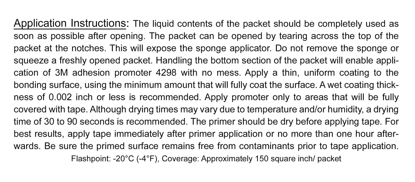 3M Adhesion Promoter 4298 Is A Detectable Primer Sponge Packet Used For Most Low Surface Energy Plastics. This Would Include Common Low Surface Energy Plastics Used For Automotive Dash And Interior Trim Applications (Tpo, Ppo, Pp, Pc, Pc + Abs, Etc). Sponge Applicator Packet Is 2.5Cc Per Packet (3 Pack). Detectable By Uv Light. One Packet Covers Approximately 150 Square Inches Of Substrate At The Recommended Coating Thickness. Also Available In Larger Size .47Fl Oz/14Ml (Equivalent To 6 Sponge Packets) Marker/Pen With Valve Action Reversible Applicator Tip, Search Asin: B0953S3F5F. Warning: This Product Can Expose You To Chemicals Which Is [Are] Known To The State Of California To Cause Cancer And Birth Defects Or Other Reproductive Harm.