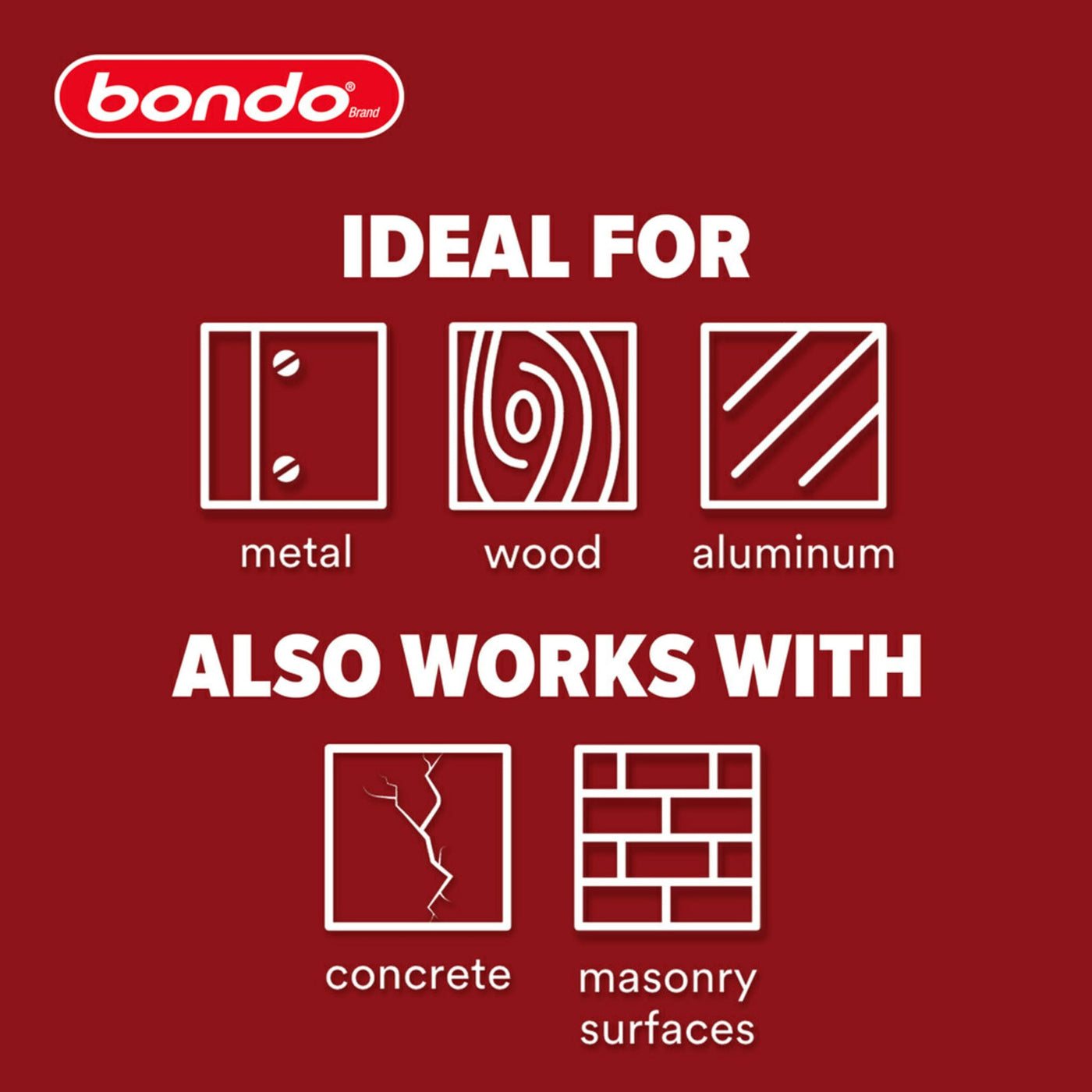 Q: What surfaces can Bondo® Fast Dry Filler be used on?A: Bondo® Fast Dry Filler is a high-adhesion filler that works on various surfaces including metal, aluminum, masonry, concrete, and more, making it versatile for both interior and exterior repairs.