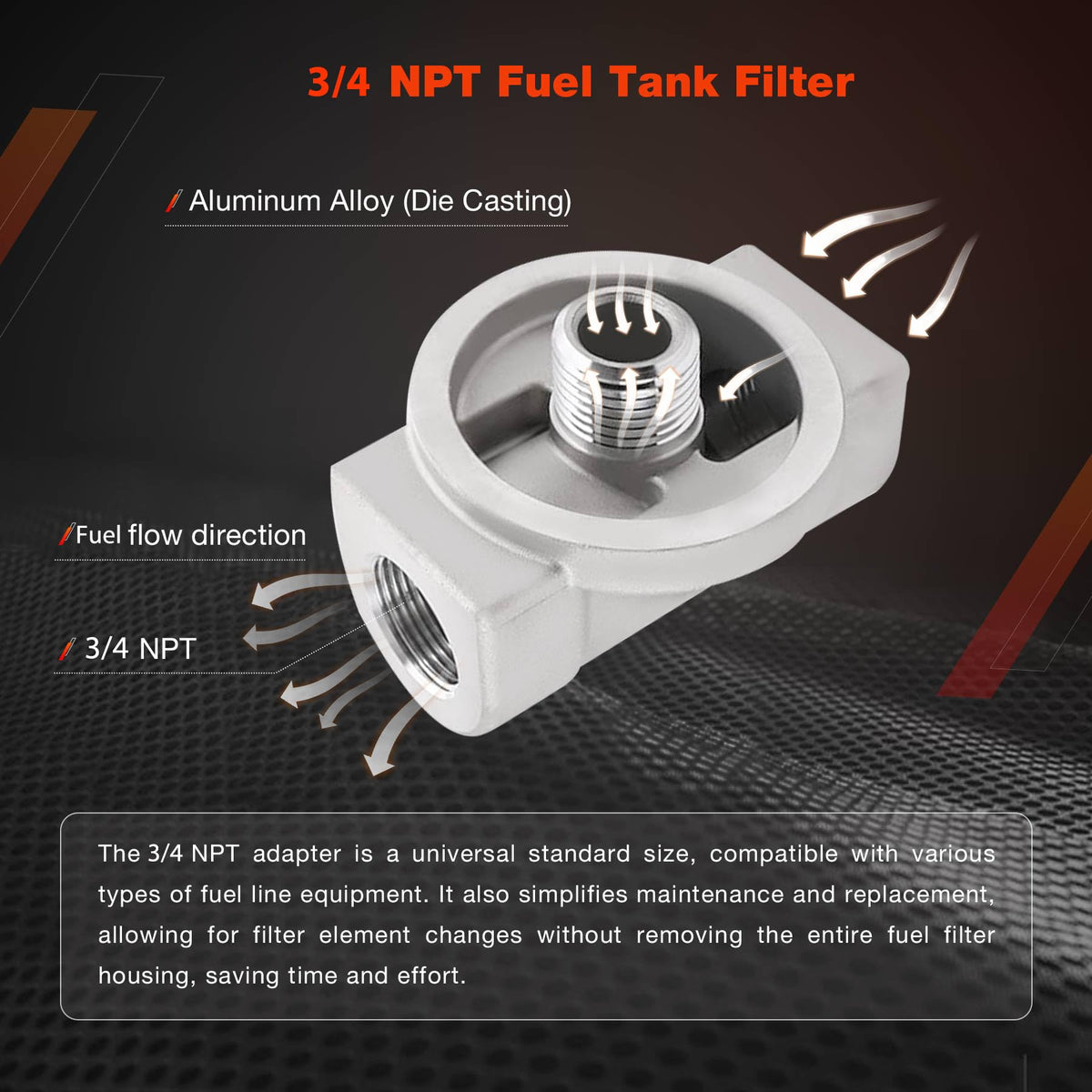 This high-efficiency fuel filter features a 10-micron filter element that effectively removes microscopic particles such as rust, sand, dirt, and lint from fuel, protecting the fuel pump and engine from contaminants. It enhances fuel combustion efficiency, improves engine performance, reduces wear on critical components, and extends the lifespan of both your equipment and fuel system. The unique design also absorbs water, preventing corrosion and rust, ensuring the safety of your fuel system. Compatible with a wide range of fuel systems, including personal vehicles, heavy machinery, and industrial equipment, it is ideal for construction and agricultural applications. Features: Material :Aluminum + Stainless Steel Style :Spin-On Maximum Pressure:50 PSI Particulate Filter: 10-micron Aluminum die cast head, vacuum impregnated for leak-proof operation. With 30-micron spin-on style filter cartridge Ideal for use in construction & agricultural applications; Removes particulate contaminants such as dirt, dust & rust Package includes: 1 Pack * spin-on style filter At ATRACYPART, we take pride in the quality of our products and in your satisfaction. If you have any problems, do not hesitate to contact us