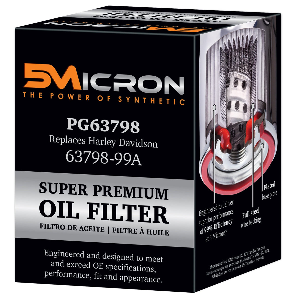 5Micron is super premium oil filter built to the highest standard in the industry. PG63798 5Micron media is full synthetic, dual-phase filtration media that provides high capacity.It is engineered and made in the USA by one best and most advanced filtration media manufacturer it is designed to remove up to 99% of particles>5 microns.5Micron filtration media offers lower flow restriction while maintaining current levels of filter efficiency and containment-holding capacity. It is the only aftermarket filter to replace Harley-Davidson's 5 Micron SuperPremium5 Oil Filter, 63731-99A. It Fits 19999-newer Twin Cam and Evolution models (except '08-'13 XR) and can be used as an upgrade for any motorcycle that requires Oil Filter P/N 63796-77A, 63805-80A, 63812-90 or 63813-90The filter's housing is platted in 10 progressive steps to ensure premium finish,shine and corrosion resistance. Unlike the OE, our base baseplate is plated to ensure longevity and superior appearance. Unlike the OE, we use silicone gasket and anti-drain-back valve that can withstand extreme temperatures while maintaining it elasticity and compression setSee what it fits: 2002-97 Buell M2 Cyclone2002-02 Buell M2L Cyclone1998-96 Buell S1 Lightning1998-98 Buell S1 White Lightning1996-95 Buell S2 Thunderbolt1996-96 Buell S2T Thunderbolt1999-97 Buell S3 Thunderbolt1999-97 Buell S3T Thunderbolt2002-99 Buell X1 Lightning2002-02 Buell X1W White Lightning2016-12 Harley Davidson FLD Switchback2020-18 Harley Davidson FLDE Deluxe 1072019-18 Harley Davidson FLFB Fat Boy 1072021-19 Harley Davidson FLFBS Fat Boy 1141979 Harley Davidson FLH Electra Glide1979 Harley Davidson FLHC Electra Glide Classic2021-18 Harley Davidson FLHC Heritage Classic 1072021-18 Harley Davidson FLHCS Heritage Classic 114