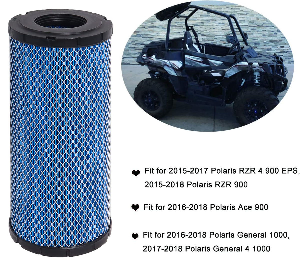 2015-2018 Air Filter Replacement 7082115 Compatible with Polaris Compatible with Polaris, ACE 900, 2016-2018 Compatible with Polaris, General 1000, 2016-2018 Compatible with Polaris, General 4 1000, 2017-2018 Compatible with Polaris, RZR 4 900, 2015-2017 Compatible with Polaris, RZR 900, 2015-2018 Compatible with Polaris, RZR S 1000, 2016-2018 Kindly Notes: This is not a Polaris OEM product and is not covered under any Polaris manufacturer's promise. The Polaris brand names and logos are the registered trademarks of their respective owners. Any use of the Polaris brand name or model designation for this product is made solely for purposes of demonstrating compatibility. The product is not sponsored or endorsed by ,or affiliated with the brands it fit ,including Polaris.