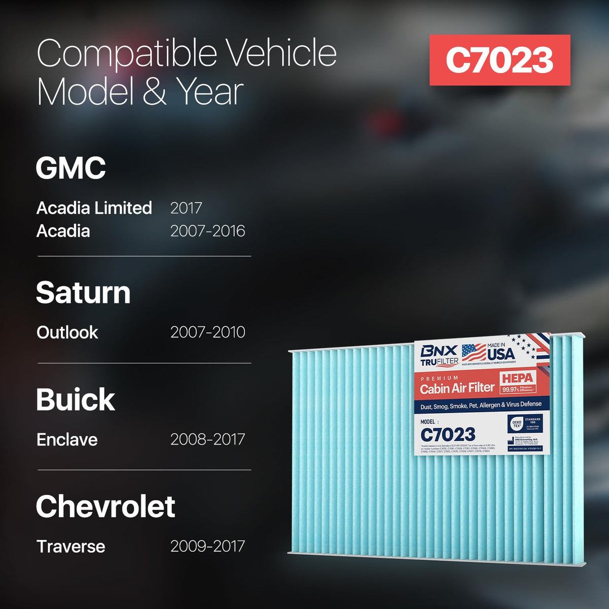 Bnx Trufilter C7023 Cabin Air Filter, Hepa 99.97%, Compatible With Gmc Acadia, Acadia Limited, Chevrolet Traverse; Saturn Outloo