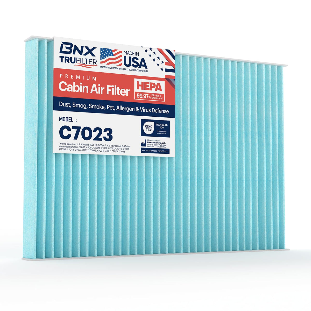 BNX Cabin Air Filters are designed using 99.97% PFE HEPA meltblown filtration media, based on U.S Standard IEST-RP-CC001.7. The premium BNX cabin filters are proudly manufactured in the U.S. and protect you against harmful microscopic particles such as smoke, smog, mold, bacteria, pet dander and more. (Registration #101638-TX-1)
