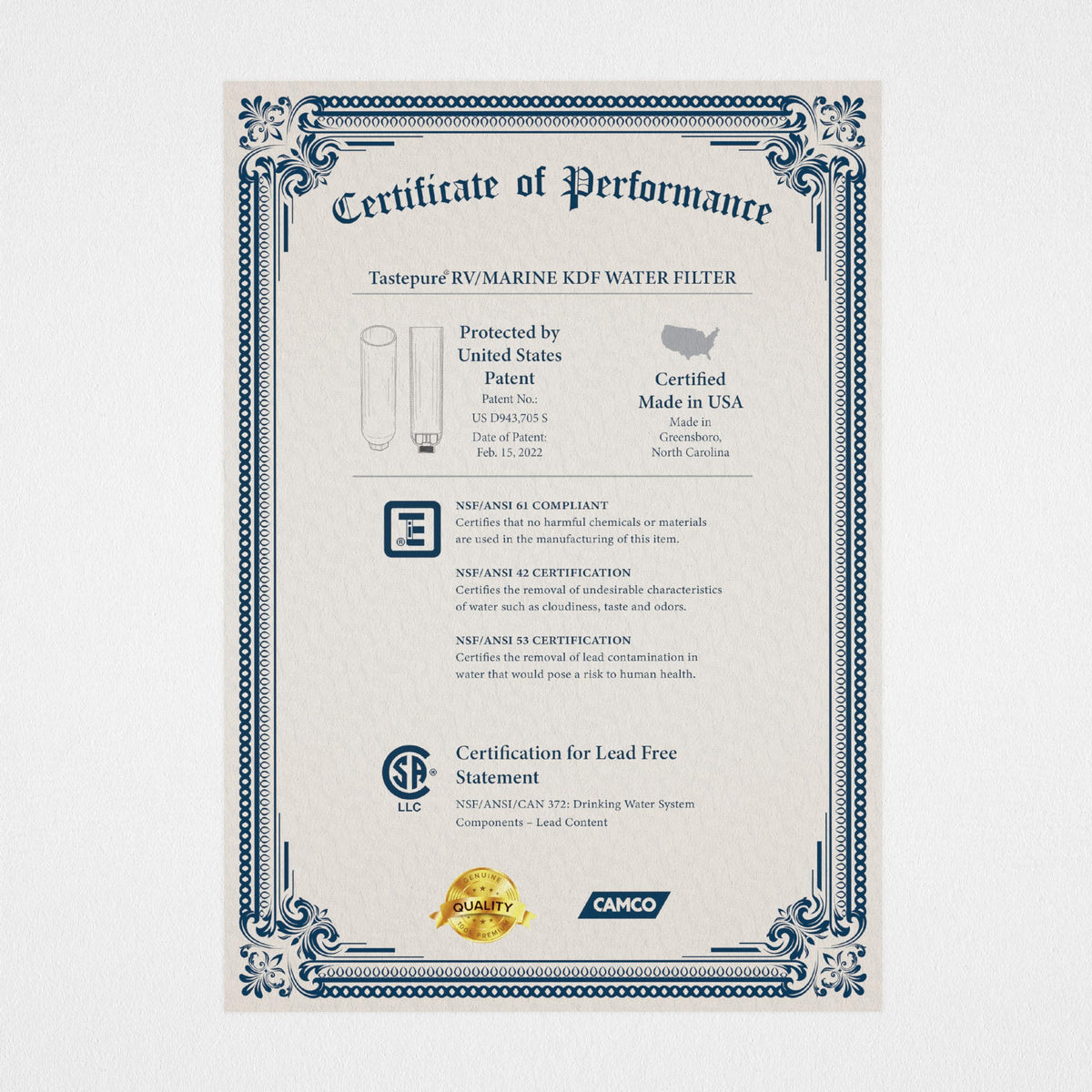 Camco Tastepure Kdf Rv Water Filter Is A Larger Capacity Rv Water Filter That Lasts An Entire Season. Greatly Reduces Bad Taste, Odors, Chlorine And Sediment In Drinking Water With A 100 Micron Sediment Filter. Durable In-Line, Exterior Mount Filter Has A Wider Body To Increase Flow. Not Designed For Fish Tanks Or Ponds.