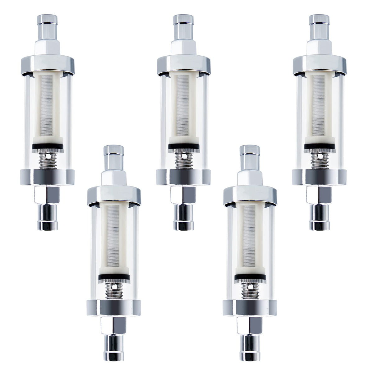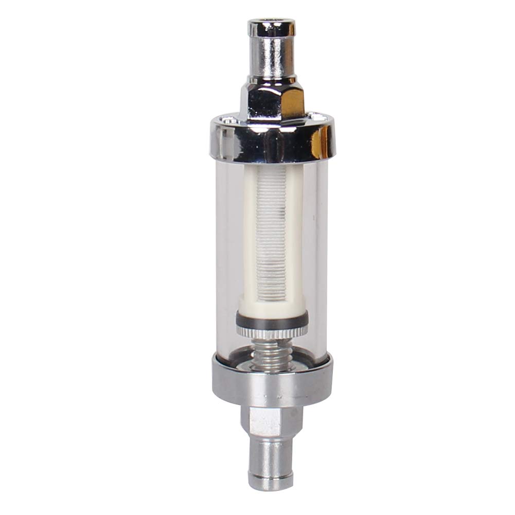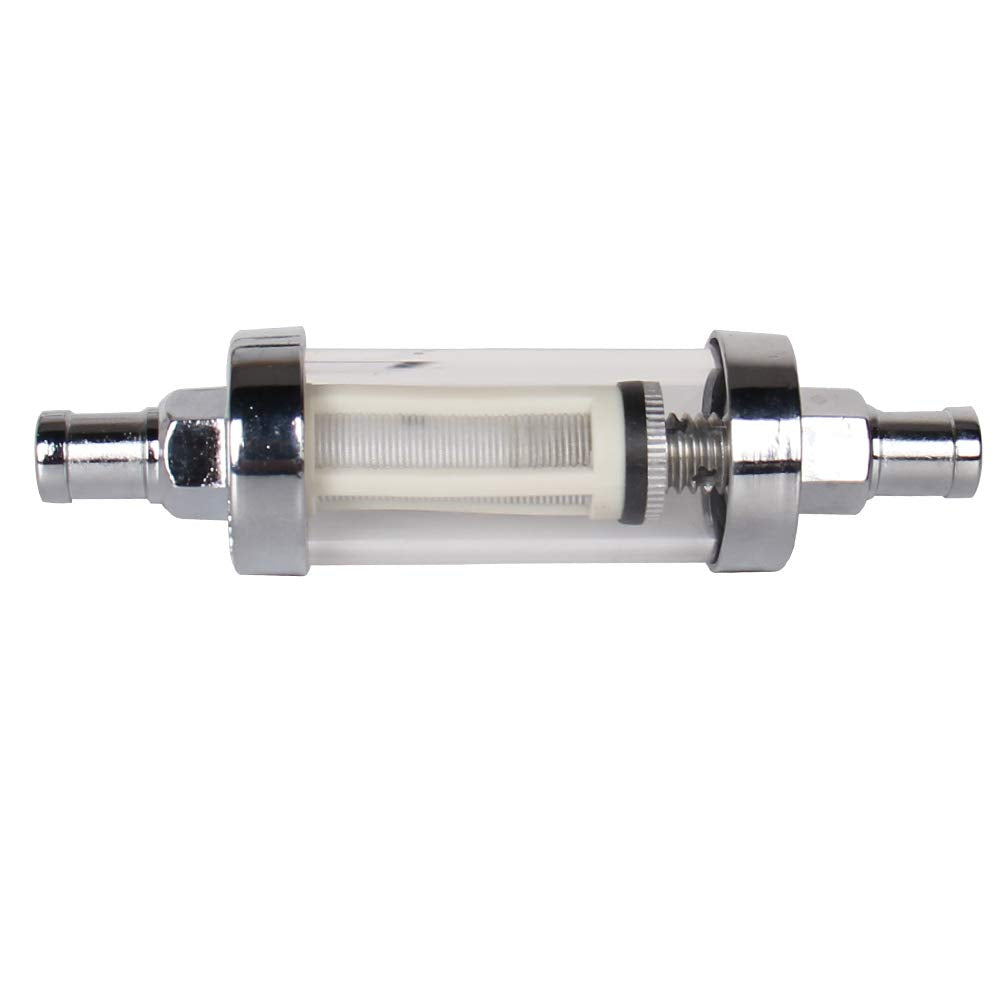 Features: A. Very Thick Glass And Good Chrome B.The Obvious, Keep It Away From Excessive Heat And Vibration. C. It'S Perfect For An Old Fuel System That Gets Dirty Floating Around From Time To Time! Specification: Fuel Filter Style: Inline Inlet Quantity: One Inlet Size: 3/8 In. /0.793 Cm Inlet Attachment: Hose Barb Outlet Quantity: One Outlet Size: 5/16 In/ 0.793 Cm Outlet Attachment: Hose Barb Filter Element Included: Yes Filter Element Material: Nylon Filter Housing Material: Glass Filter Housing Finish: Natural Overall Length (In): 4.200 In. / 10.66 Cm Outside Diameter (In): 1.070 In./ 2.717 Cm Mounting Bracket Included: No Fittings Included: No Clamps Included: No Quantity: Sold Individually