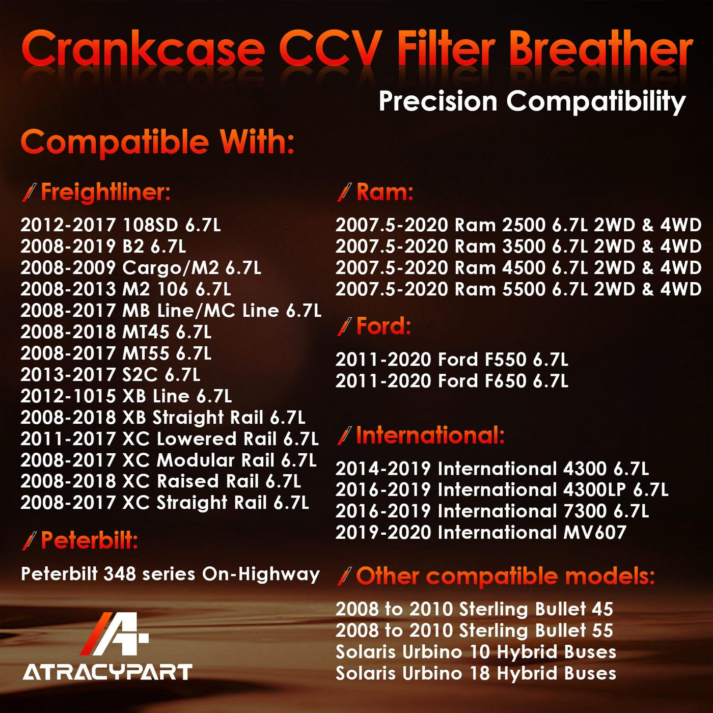Q: What vehicles are compatible with the Crankcase CCV Filter Breather Vent Element?A: The Crankcase CCV Filter Breather Vent Element is compatible with a variety of vehicles, including the 2007.5-2022 Ram 2500, 3500, 4500, and 5500 with a 6.7L ISB engine. It also fits 2011-2020 Ford F550 and F650, as well as multiple Freightliner models from 2008 to 2017, and select International and Peterbilt models.
