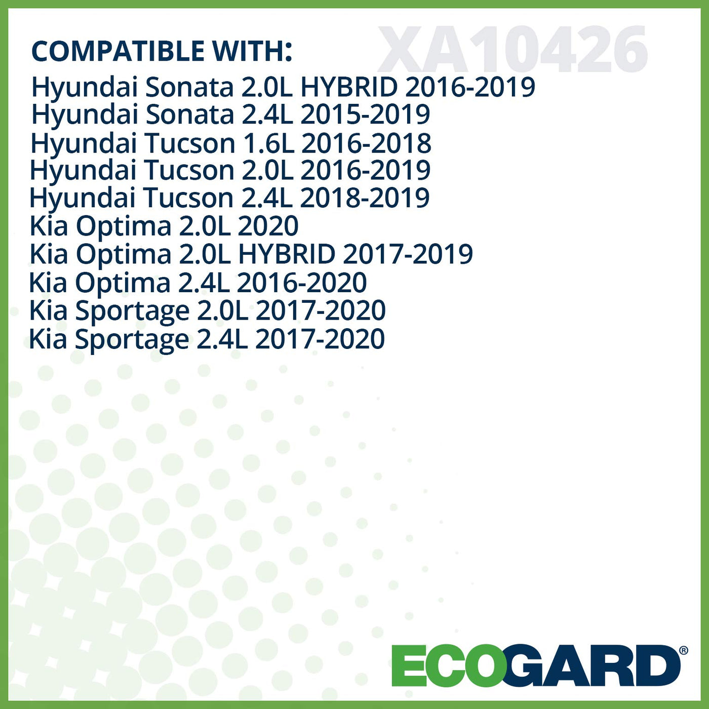 Q: What vehicles are compatible with the ECOGARD XA10426 air filter?A: The ECOGARD XA10426 air filter is compatible with multiple Hyundai and Kia models, including the Hyundai Sonata 2.4L (2015-2019), Hyundai Tucson 2.0L (2016-2021), Tucson 1.6L (2016-2018), Tucson 2.4L (2018-2021), Kia Optima 2.4L (2016-2020), and Kia Sportage 2.4L (2017-2022).