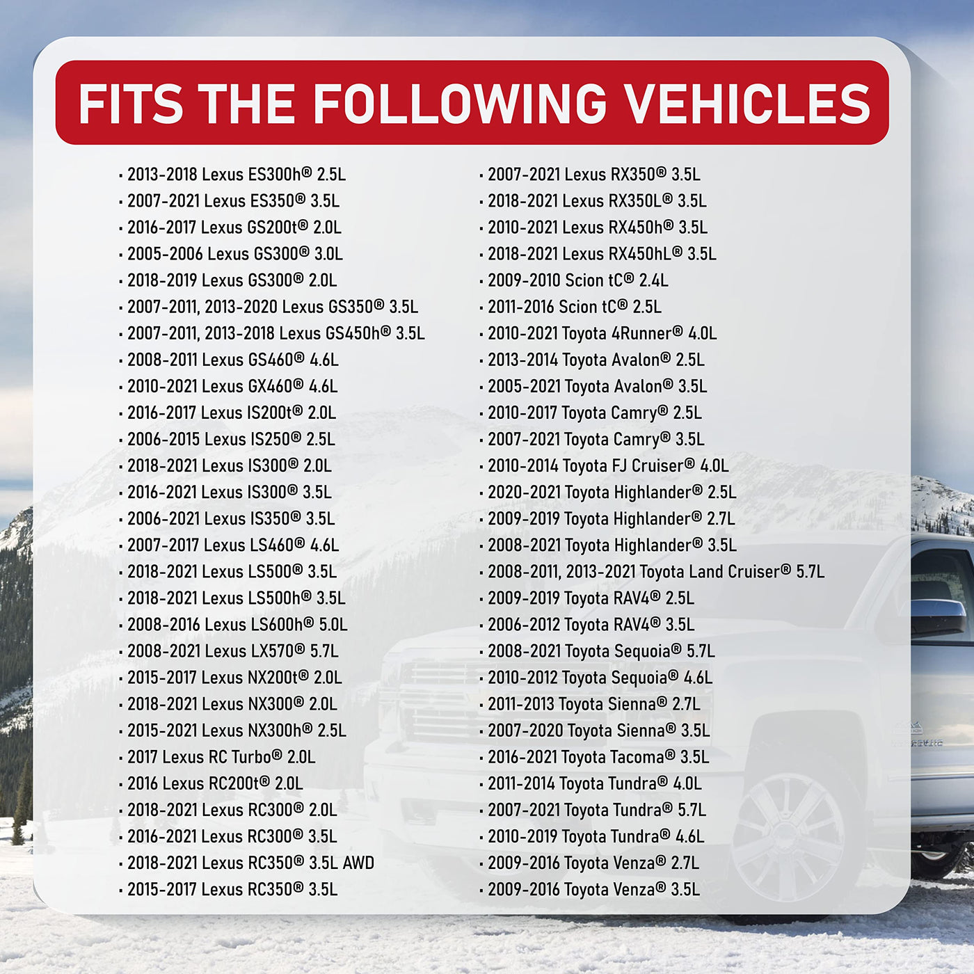 Q: What vehicles are compatible with the Engine Oil Filter Cap Assembly?A: The Engine Oil Filter Cap Assembly is compatible with a wide range of Toyota, Lexus, and Scion vehicles from 2005 to 2021, including models like Avalon, Camry, Highlander, RAV4, Sienna, and Venza. Specific models include the ES300h, ES350, GS200t, GS350, 4Runner, and many more.